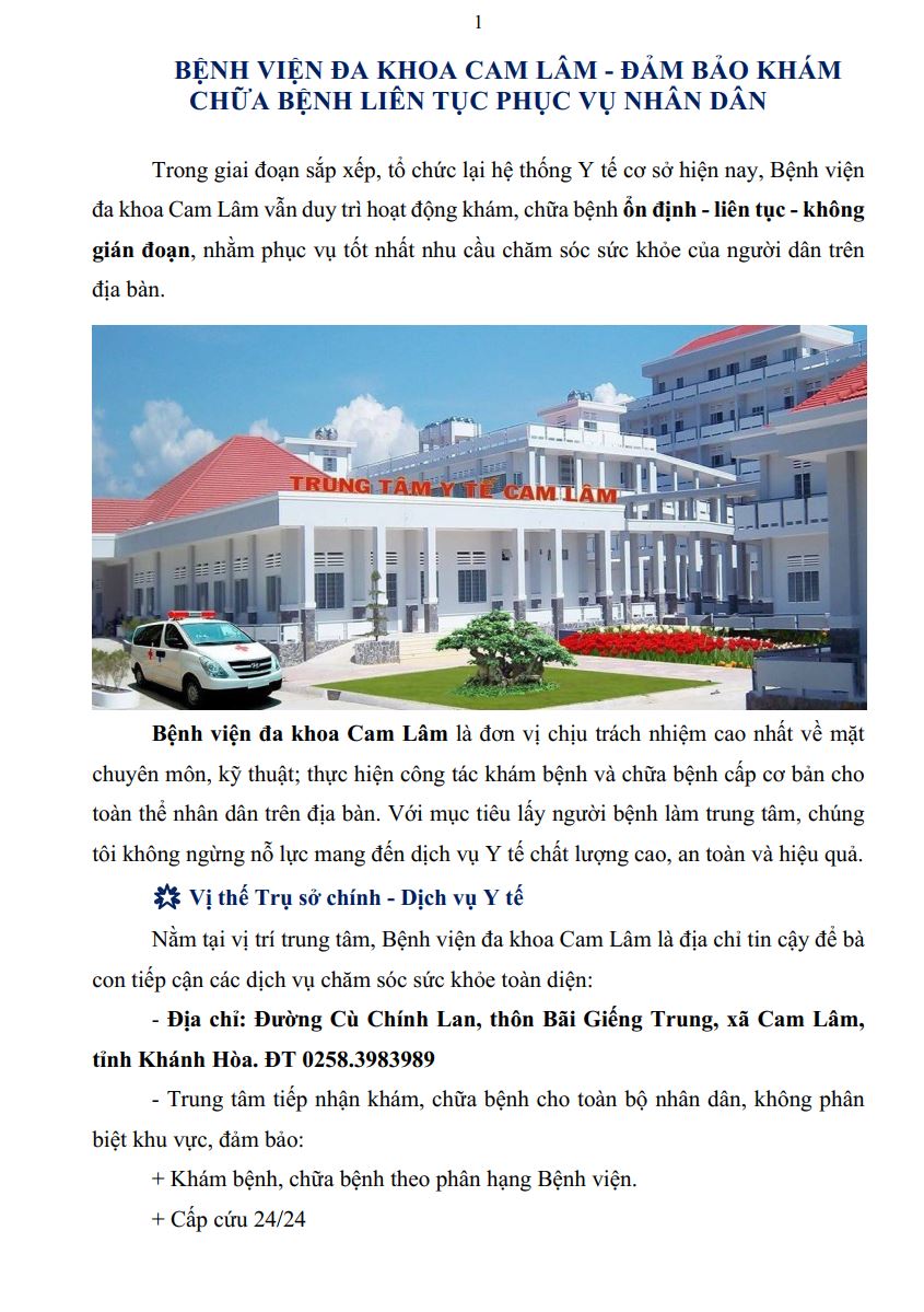 BỆNH VIỆN ĐA KHOA CAM LÂM – ĐẢM BẢO KHÁM CHỮA BỆNH LIÊN TỤC PHỤC VỤ NHÂN DÂN 04/04/2026 0 8 FacebookTwitterPinterestWhatsApp BỆNH VIỆN ĐA KHOA CAM LÂM – ĐẢM BẢO KHÁM CHỮA BỆNH LIÊN TỤC PHỤC VỤ NHÂN DÂN