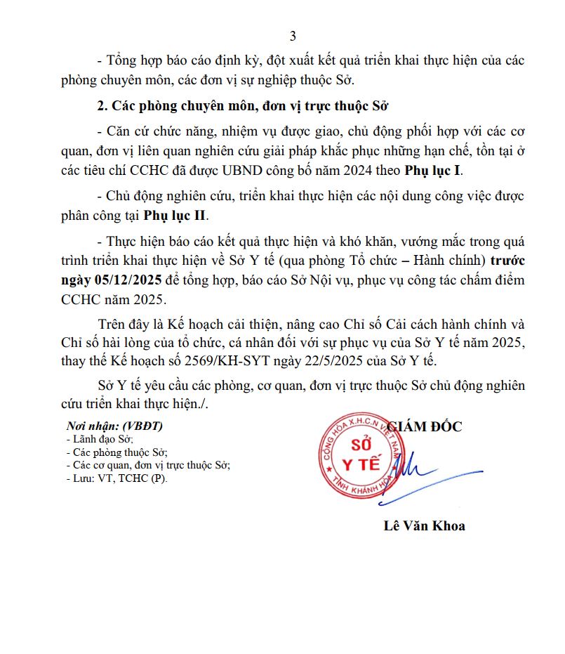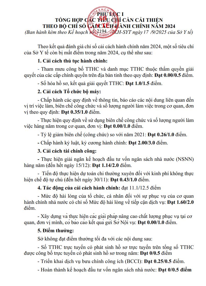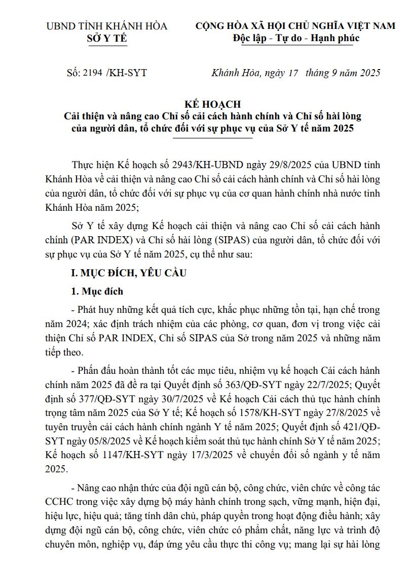 KẾ HOẠCH Cải thiện và nâng cao Chỉ số cải cách hành chính và Chỉ số hài lòng của người dân, tổ chức đối với sự phục vụ của Sở Y tế năm 2025 18/09/2025 0 26 FacebookTwitterPinterestWhatsApp KẾ HOẠCH Cải thiện và nâng cao Chỉ số cải cách hành chính và Chỉ số hài lòng của người dân, tổ chức đối với sự phục vụ của Sở Y tế năm 2025