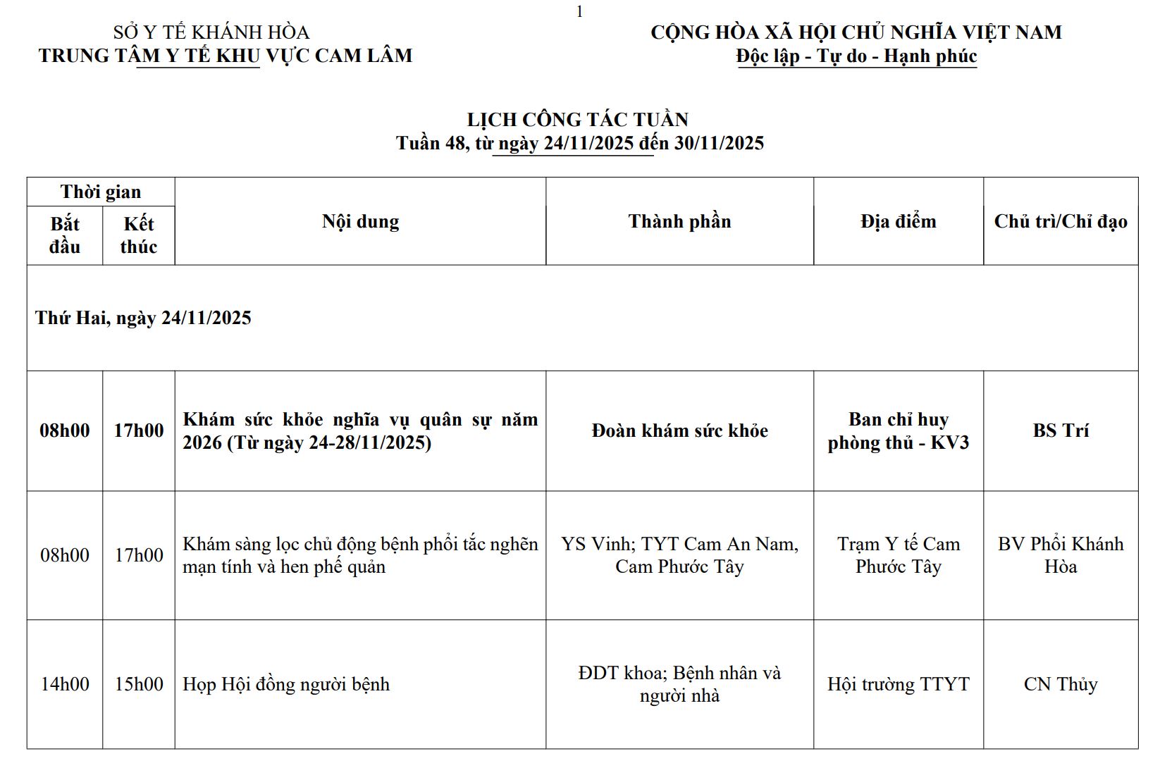 LỊCH CÔNG TÁC TUẦN THỨ 48 (2025)