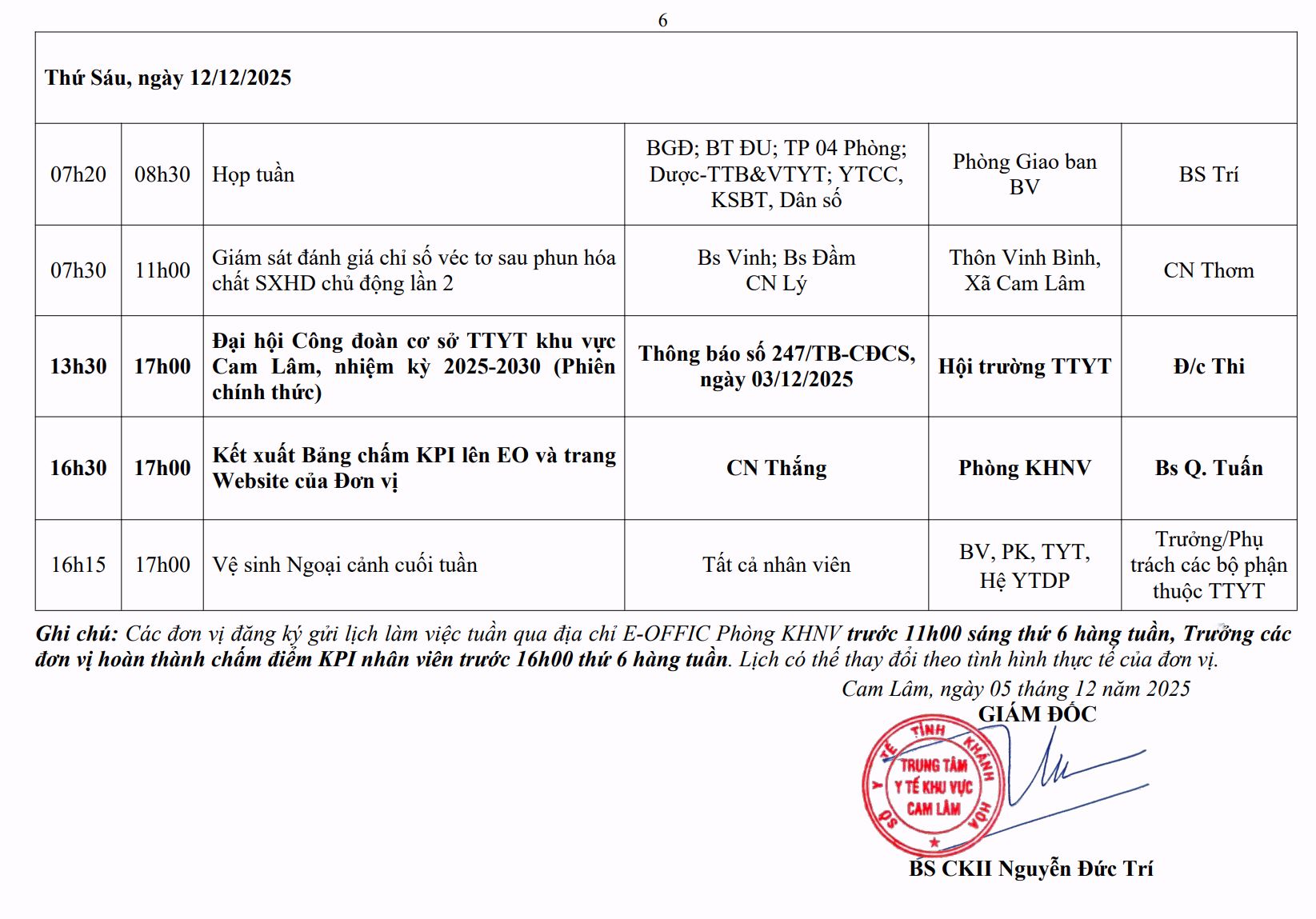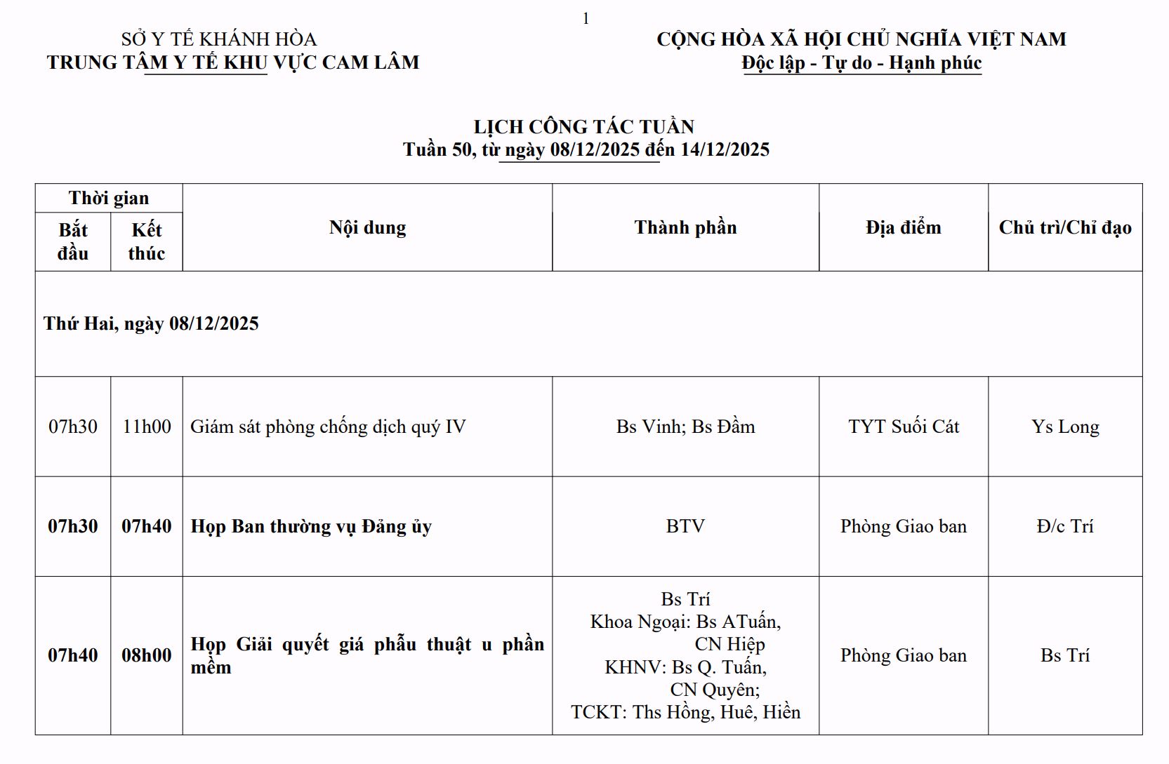 LỊCH CÔNG TÁC TUẦN THỨ 50 (2025)