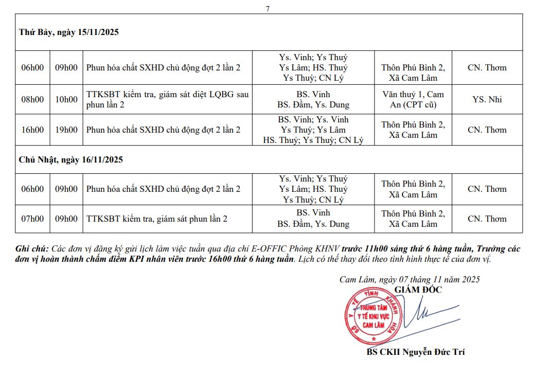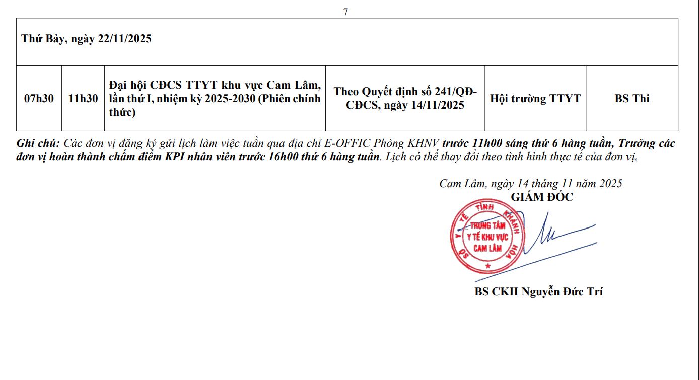 LỊCH CÔNG TÁC TUẦN THỨ 7 (2025)