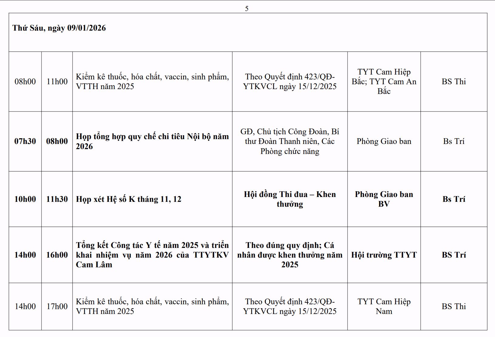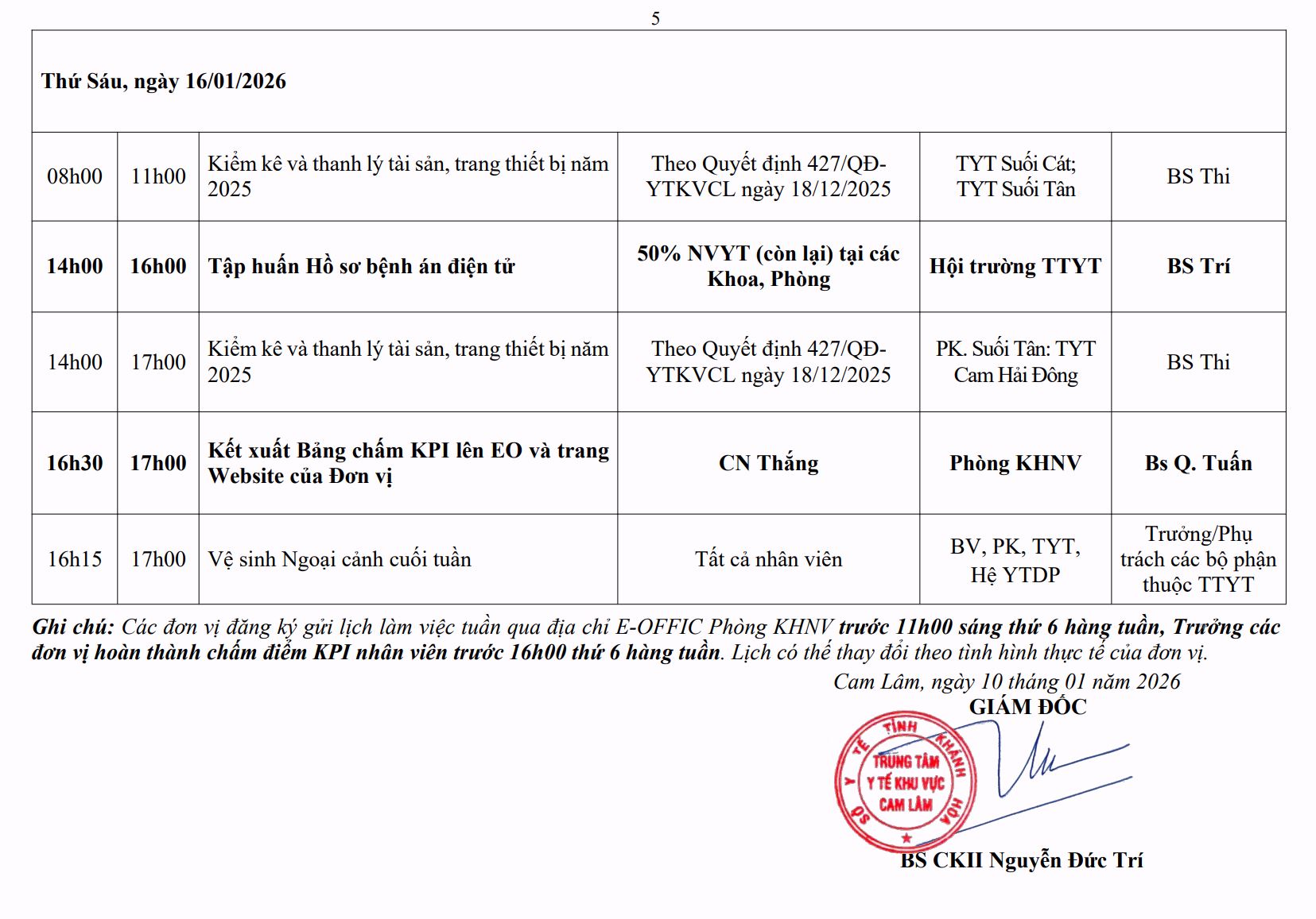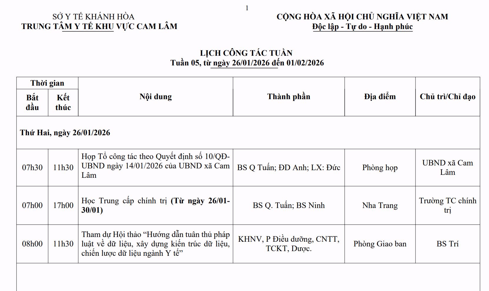 LỊCH CÔNG TÁC TUẦN THỨ 5 (2026)