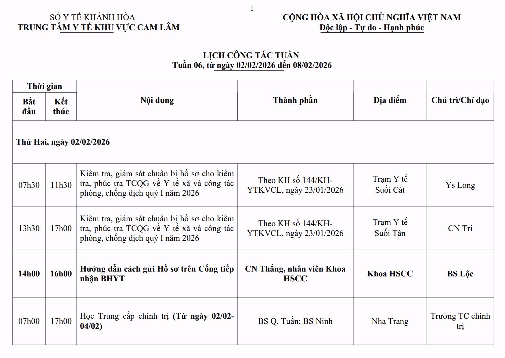 LỊCH CÔNG TÁC TUẦN THỨ 6 (2026)