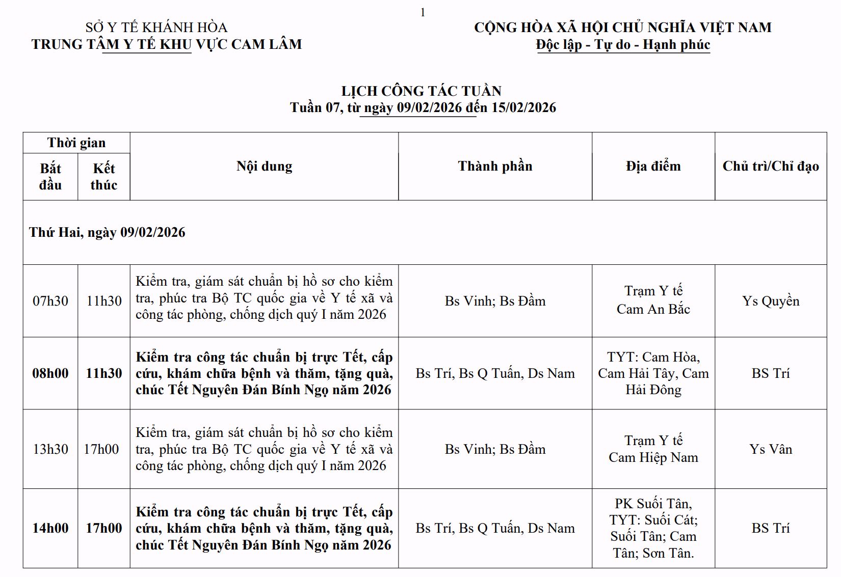 LỊCH CÔNG TÁC TUẦN THỨ 7 (2026)