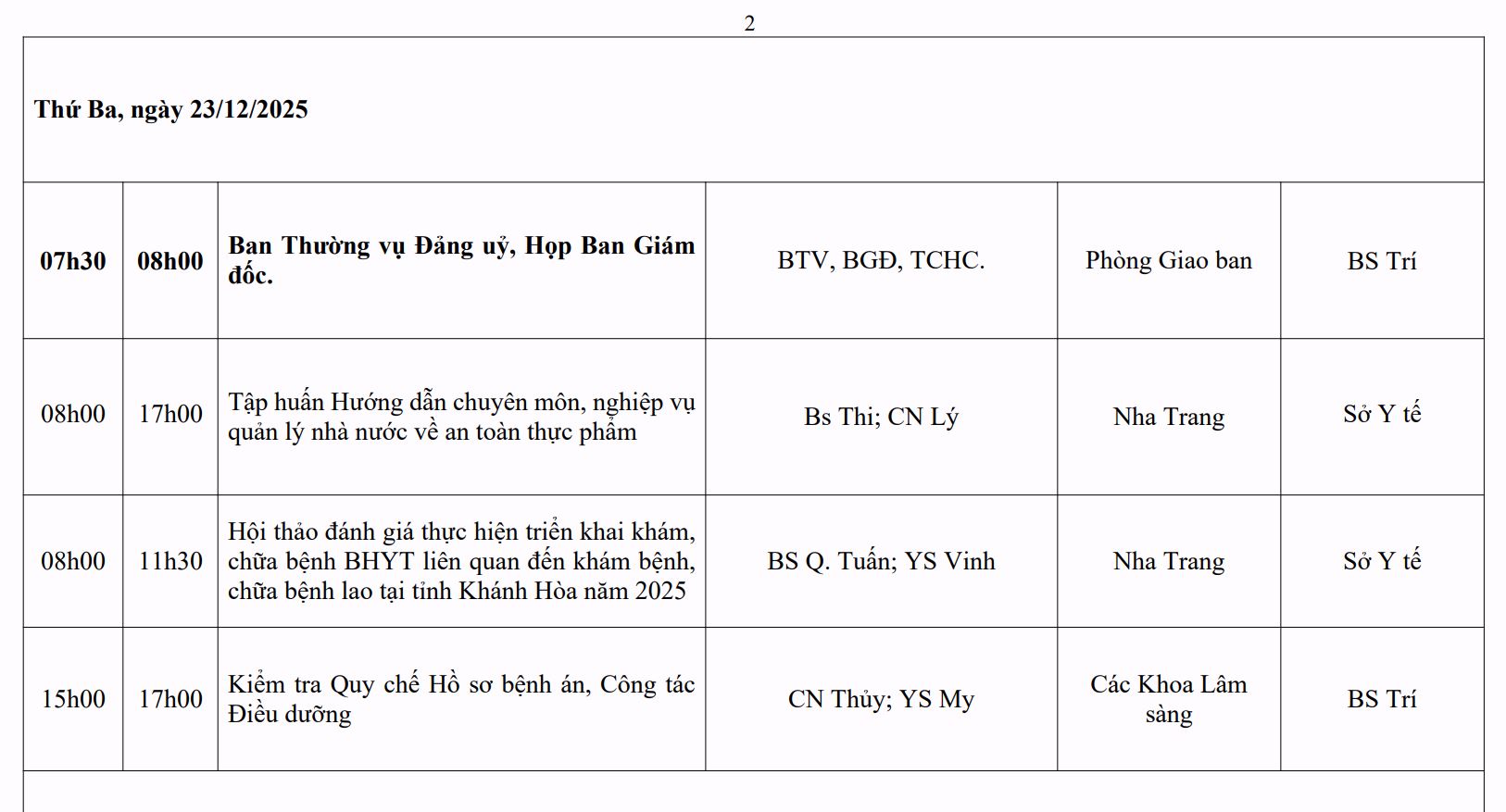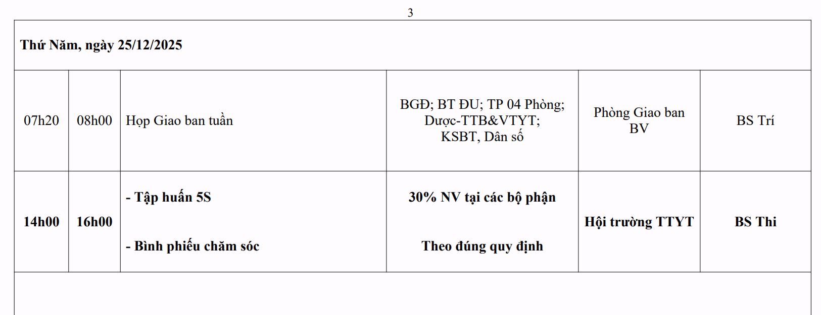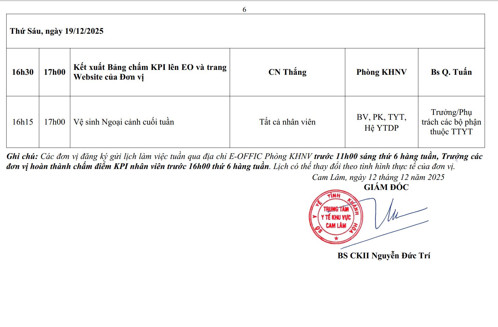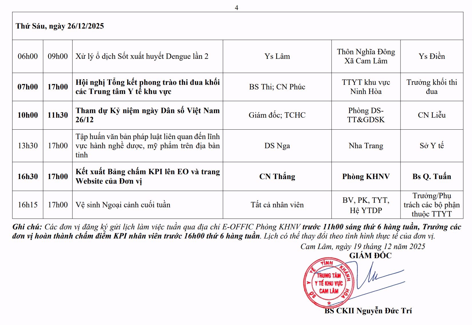 LỊCH CÔNG TÁC TUẦN THỨ 52 (2025)