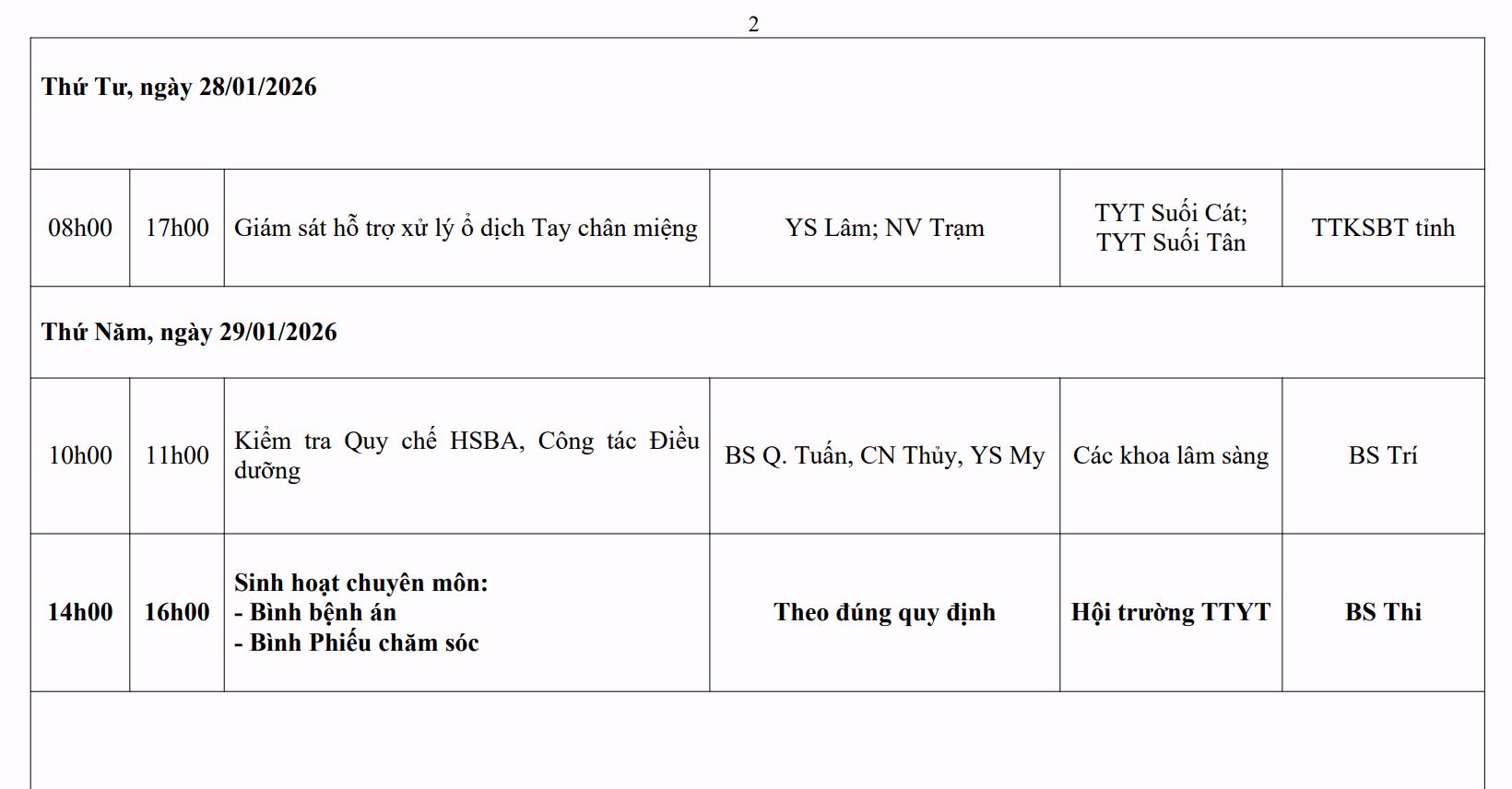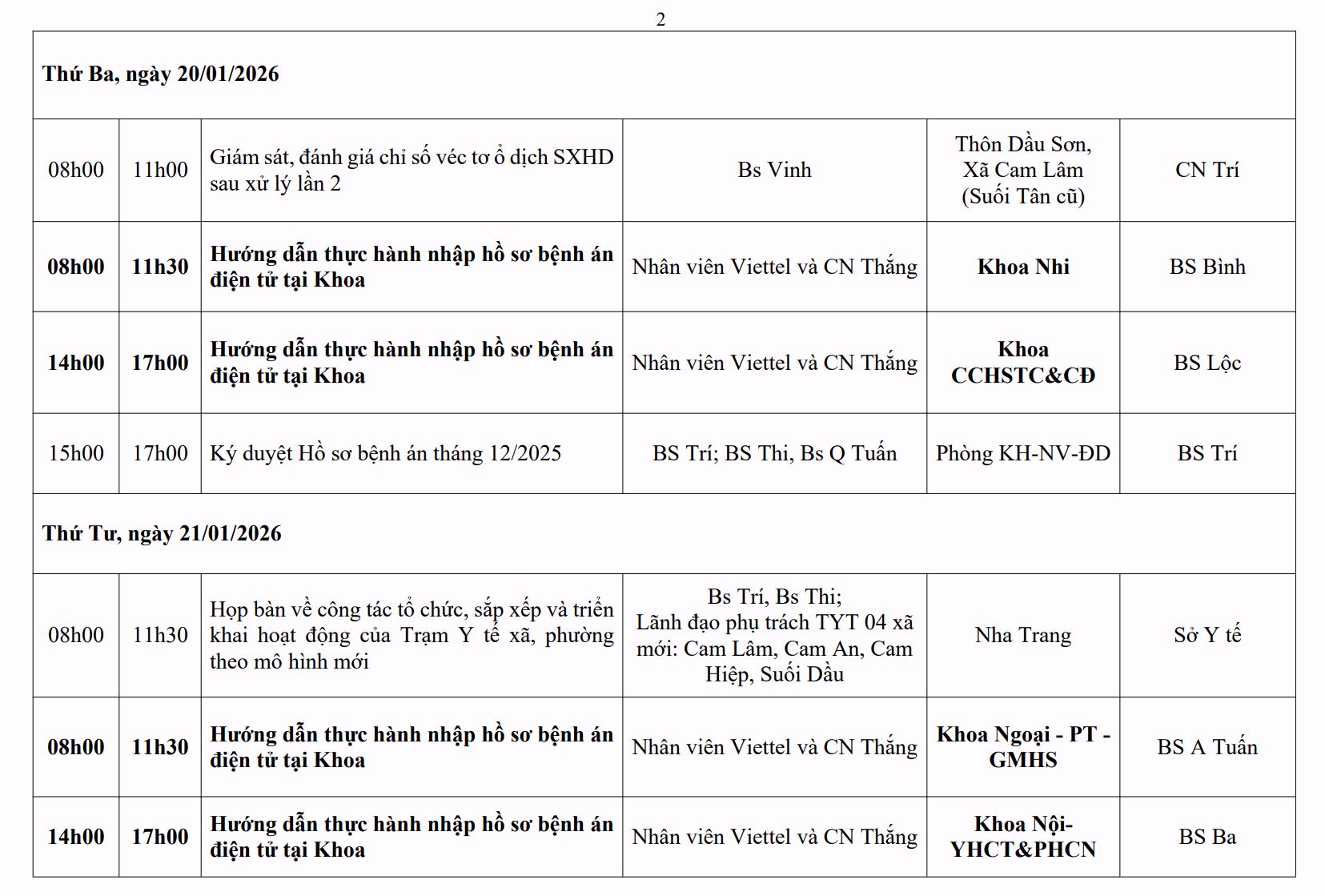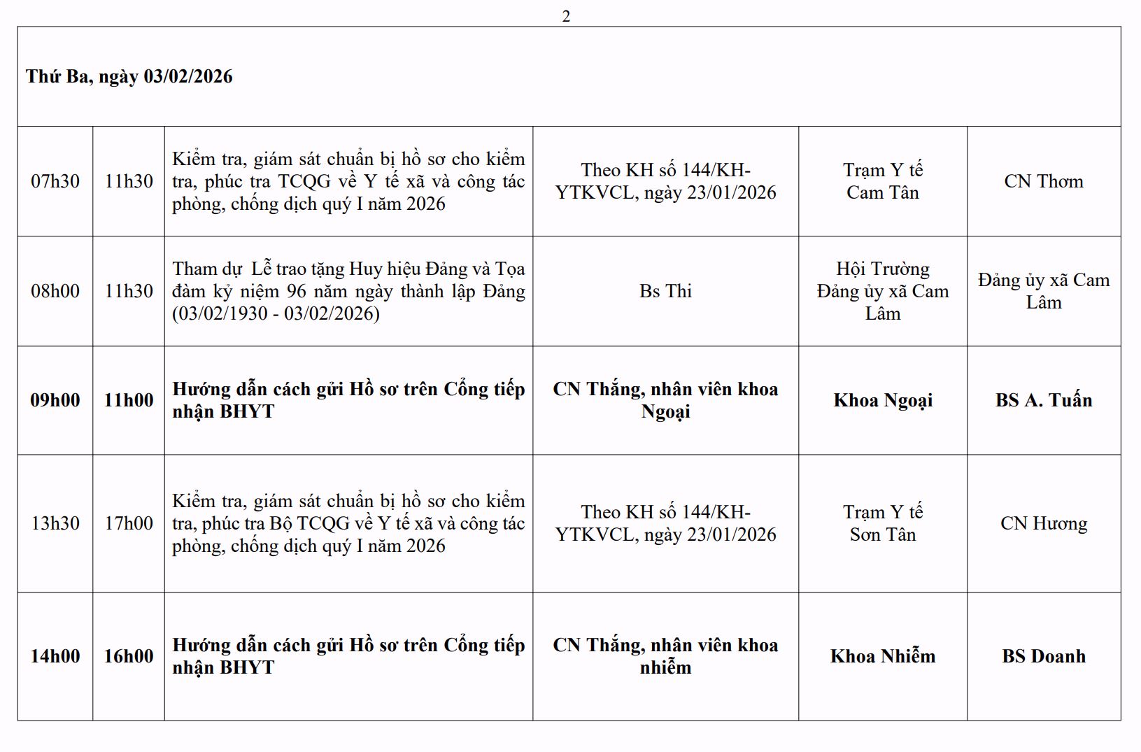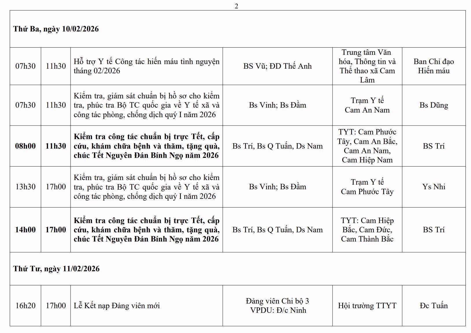 LỊCH CÔNG TÁC TUẦN THỨ 2 (2026)
