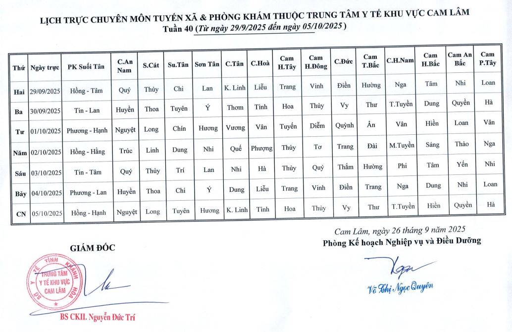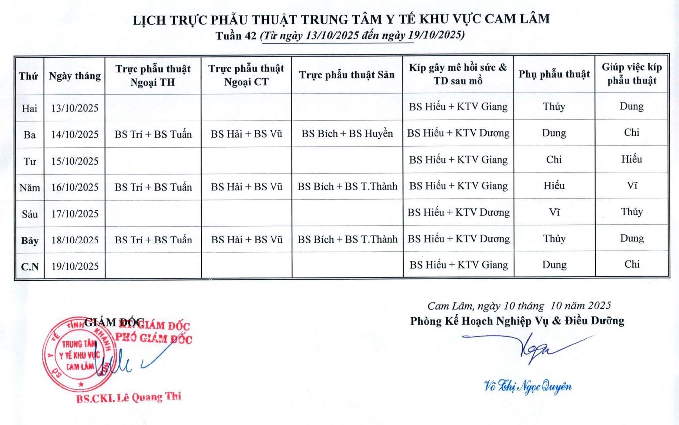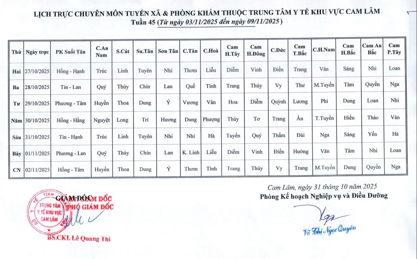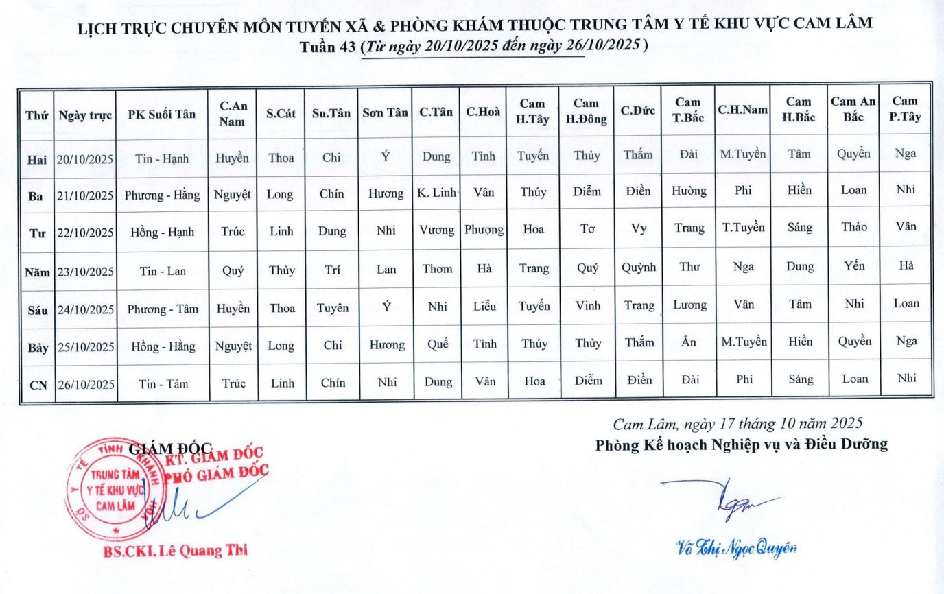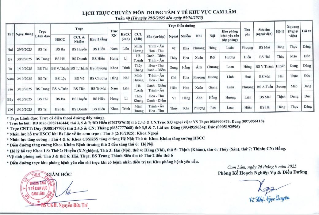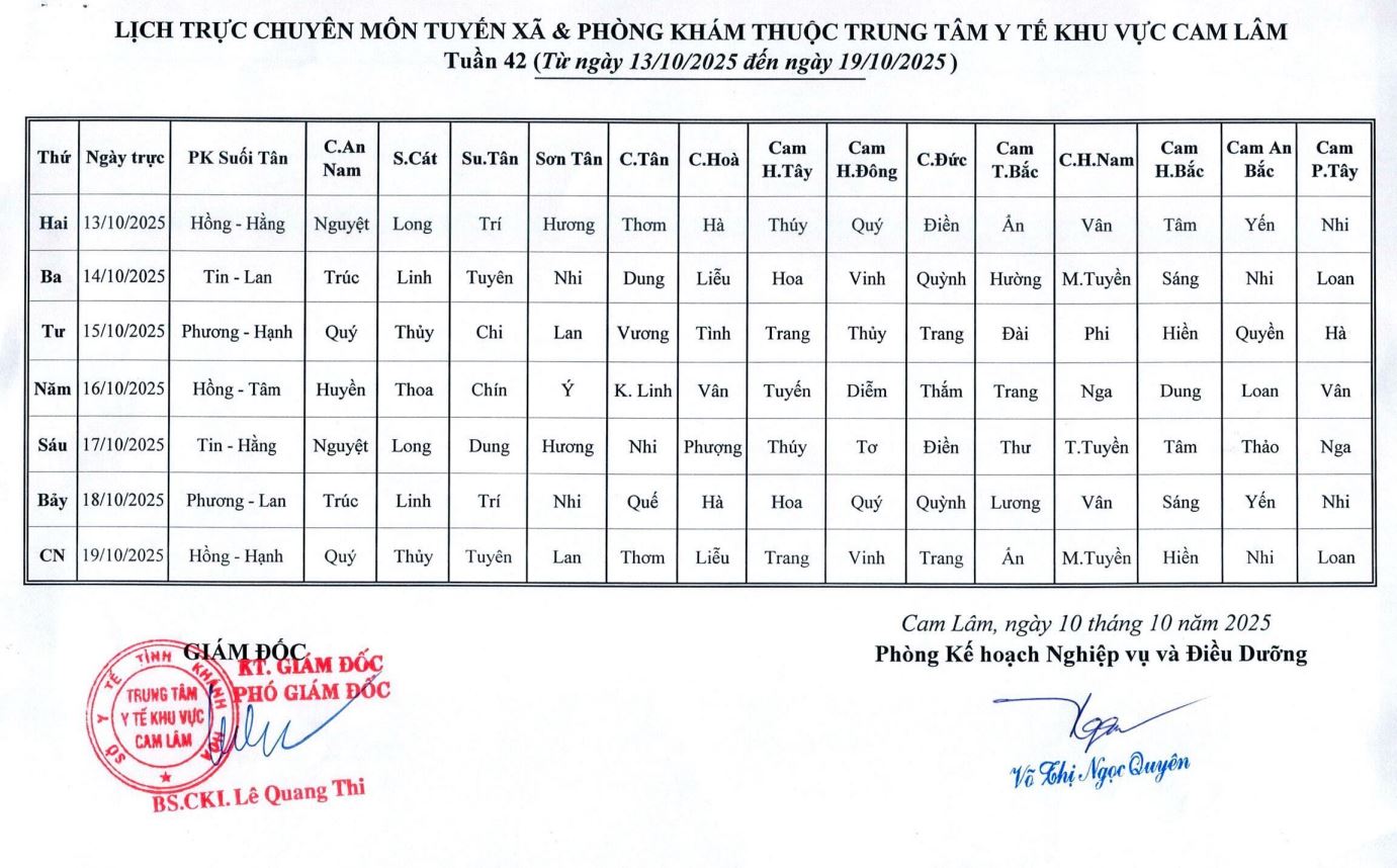 Lịch trực BV dã chiến (TTYT Cam Lâm, Đồng Cau)& LT chuyên môn tuần 35