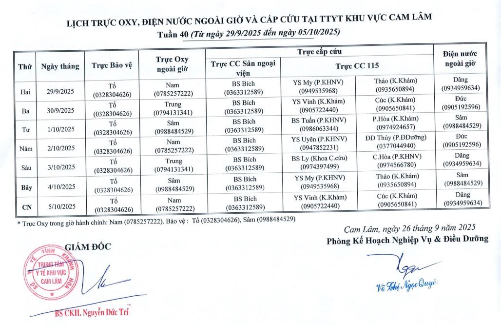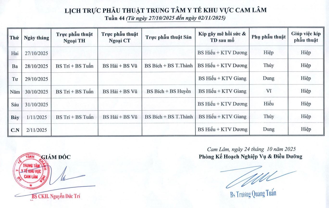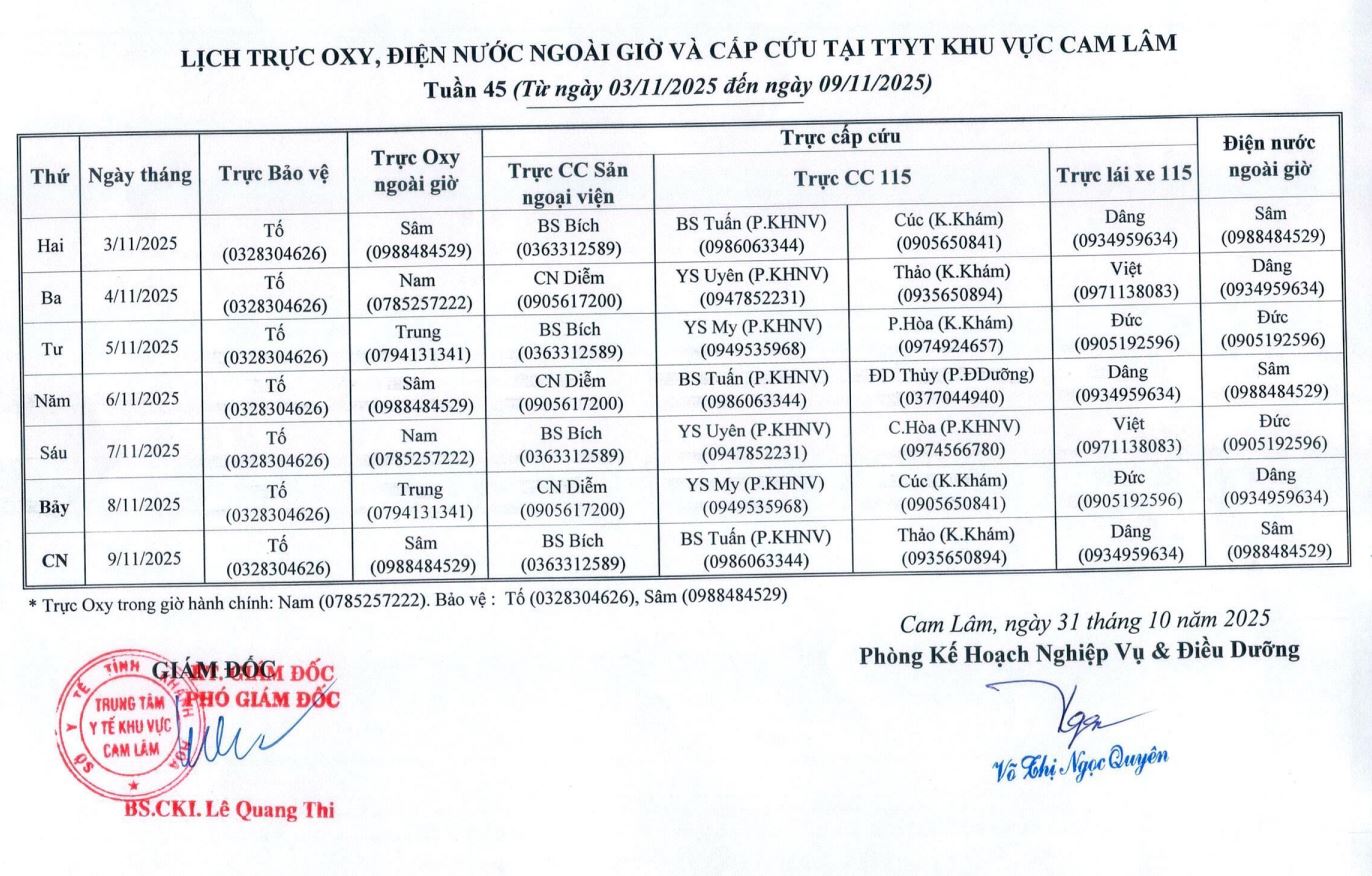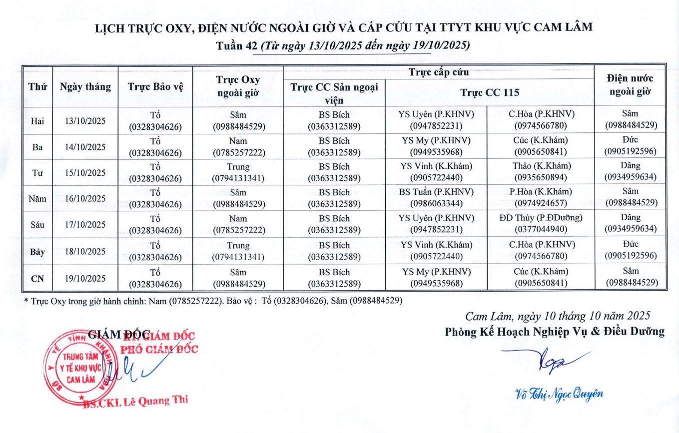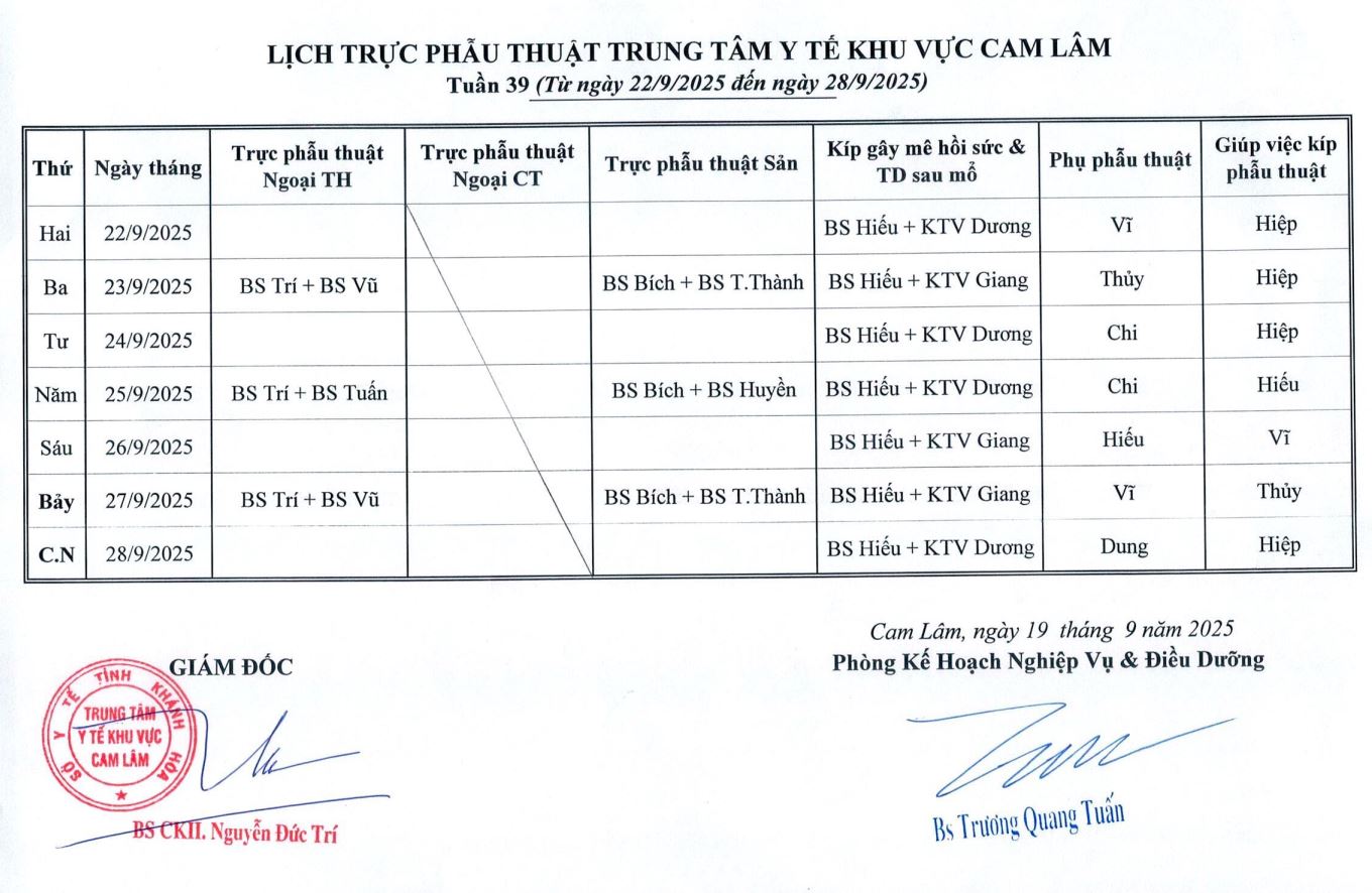 Lịch trực BV dã chiến (TTYT Cam Lâm, Đồng Cau)& LT chuyên môn tuần 35