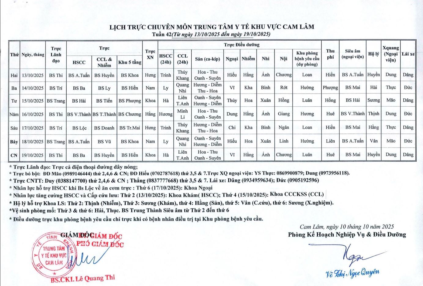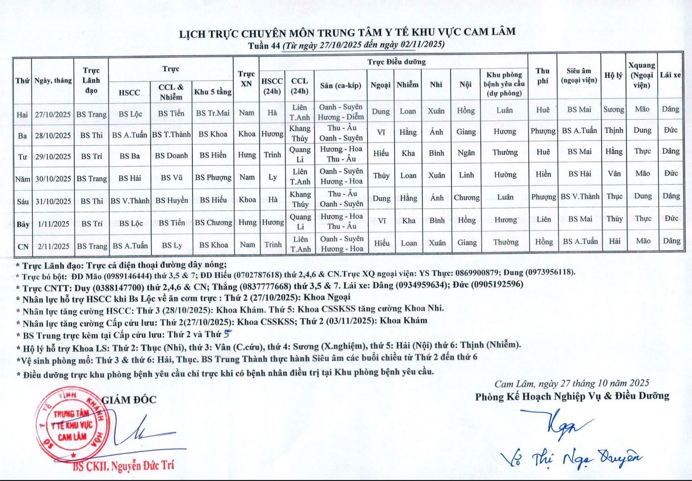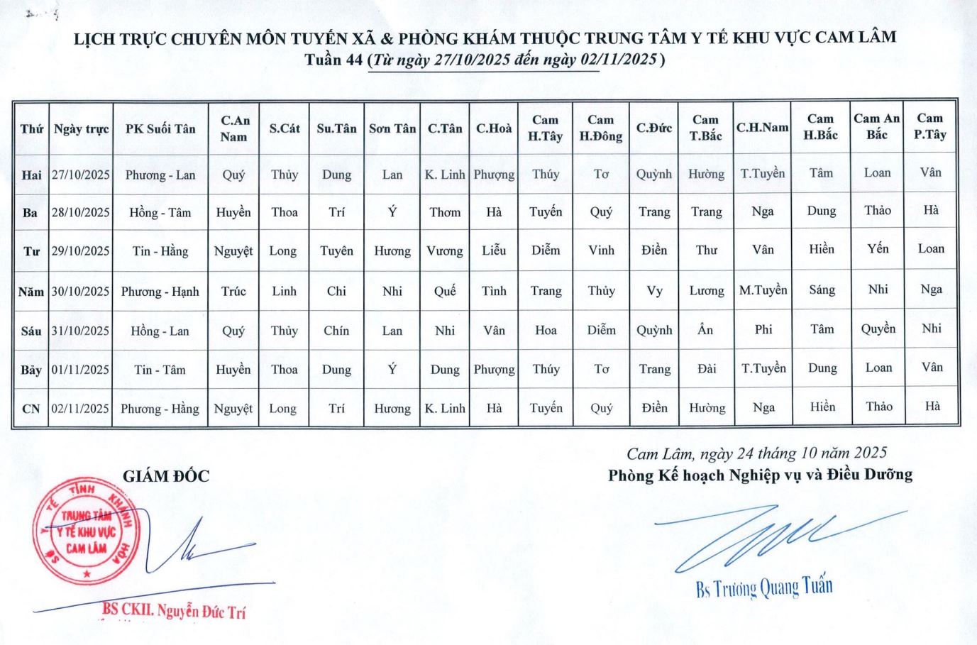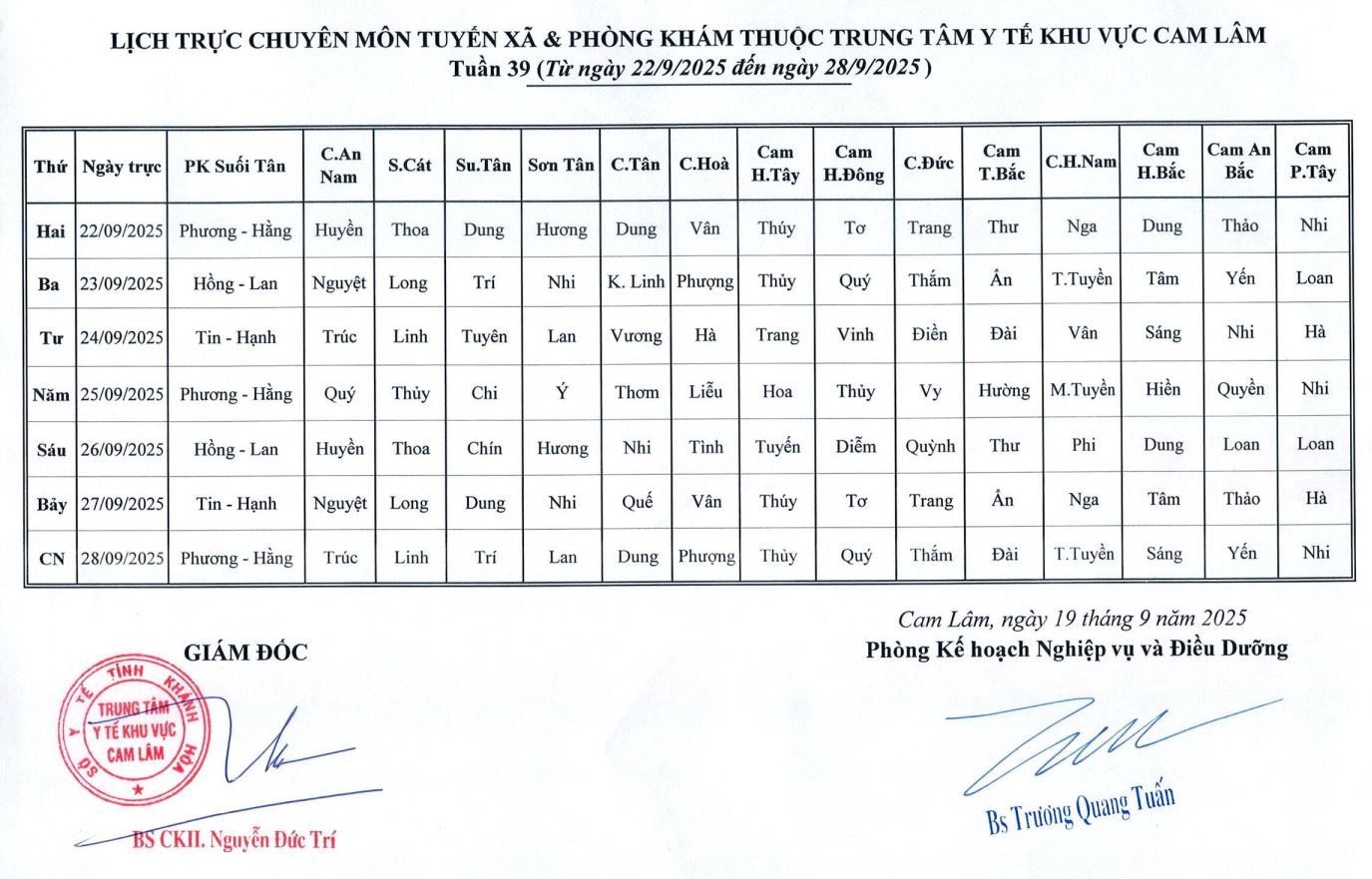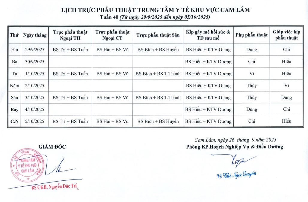 Lịch trực BV dã chiến (TTYT Cam Lâm, Đồng Cau)& LT chuyên môn tuần 35