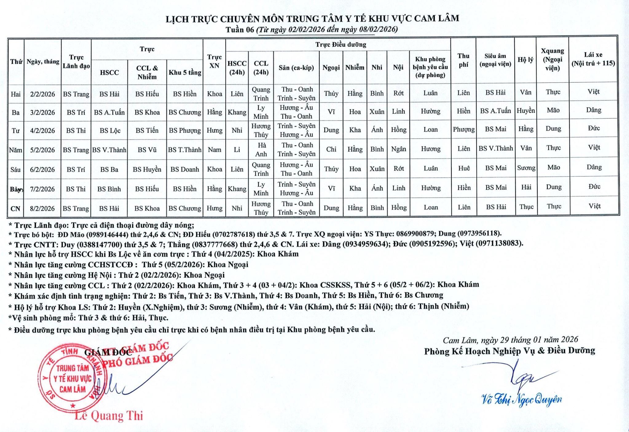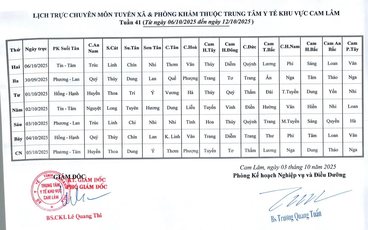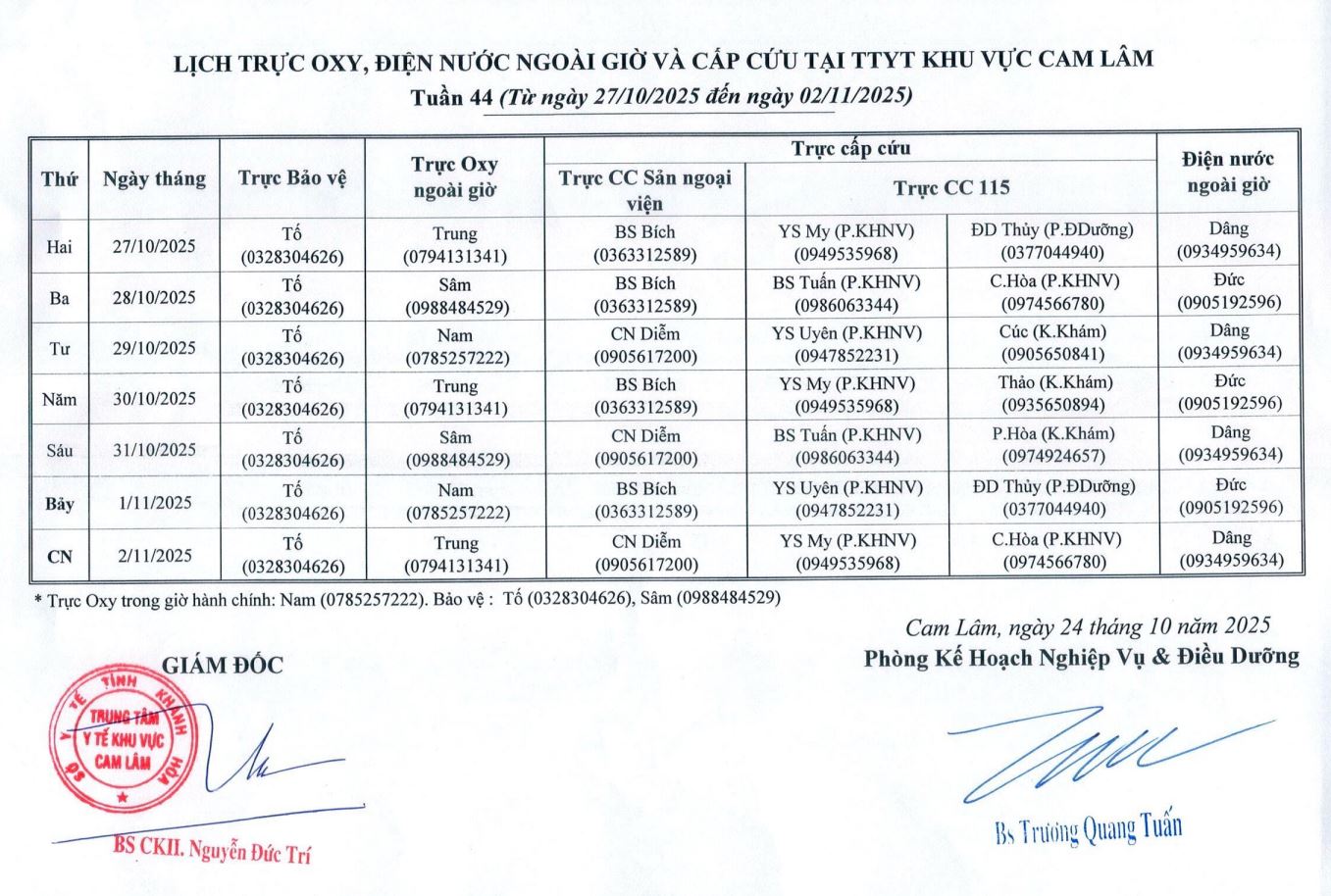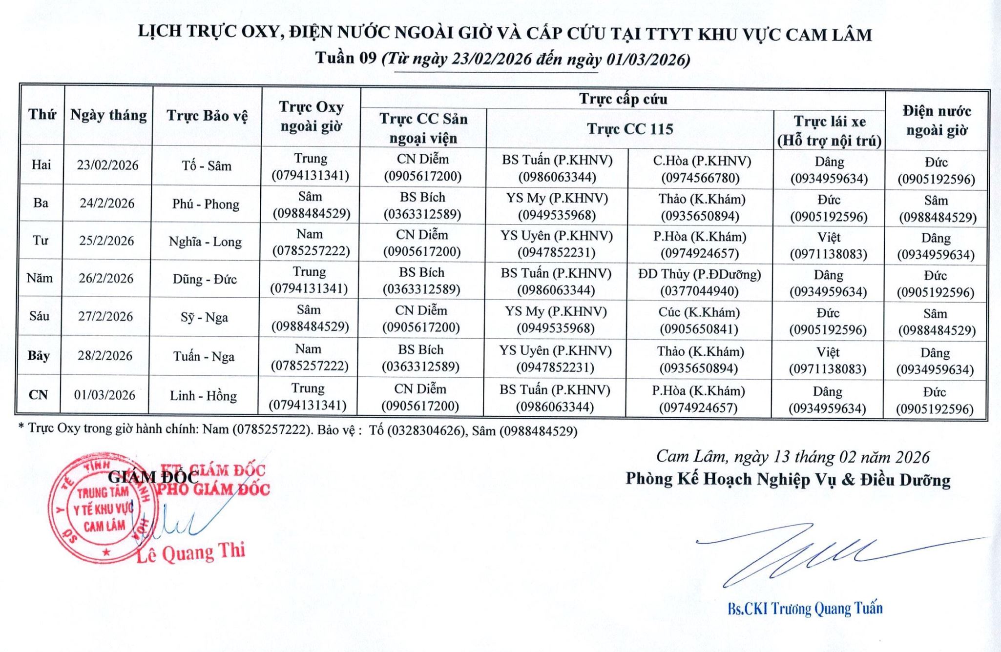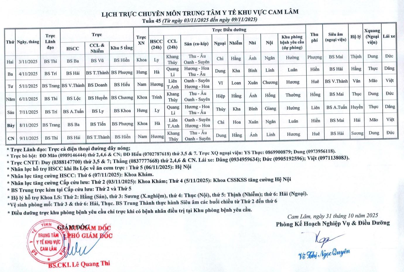 Lịch trực BV dã chiến (TTYT Cam Lâm, Đồng Cau)& LT chuyên môn tuần 35