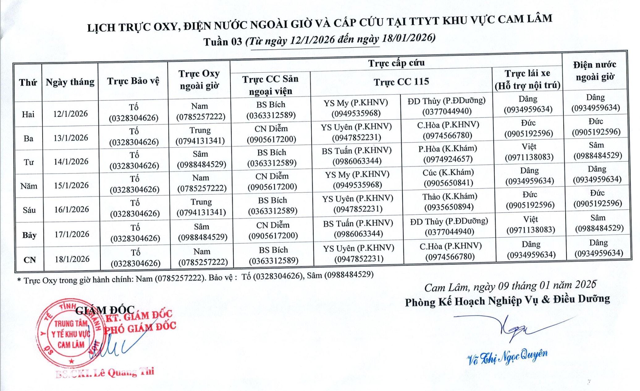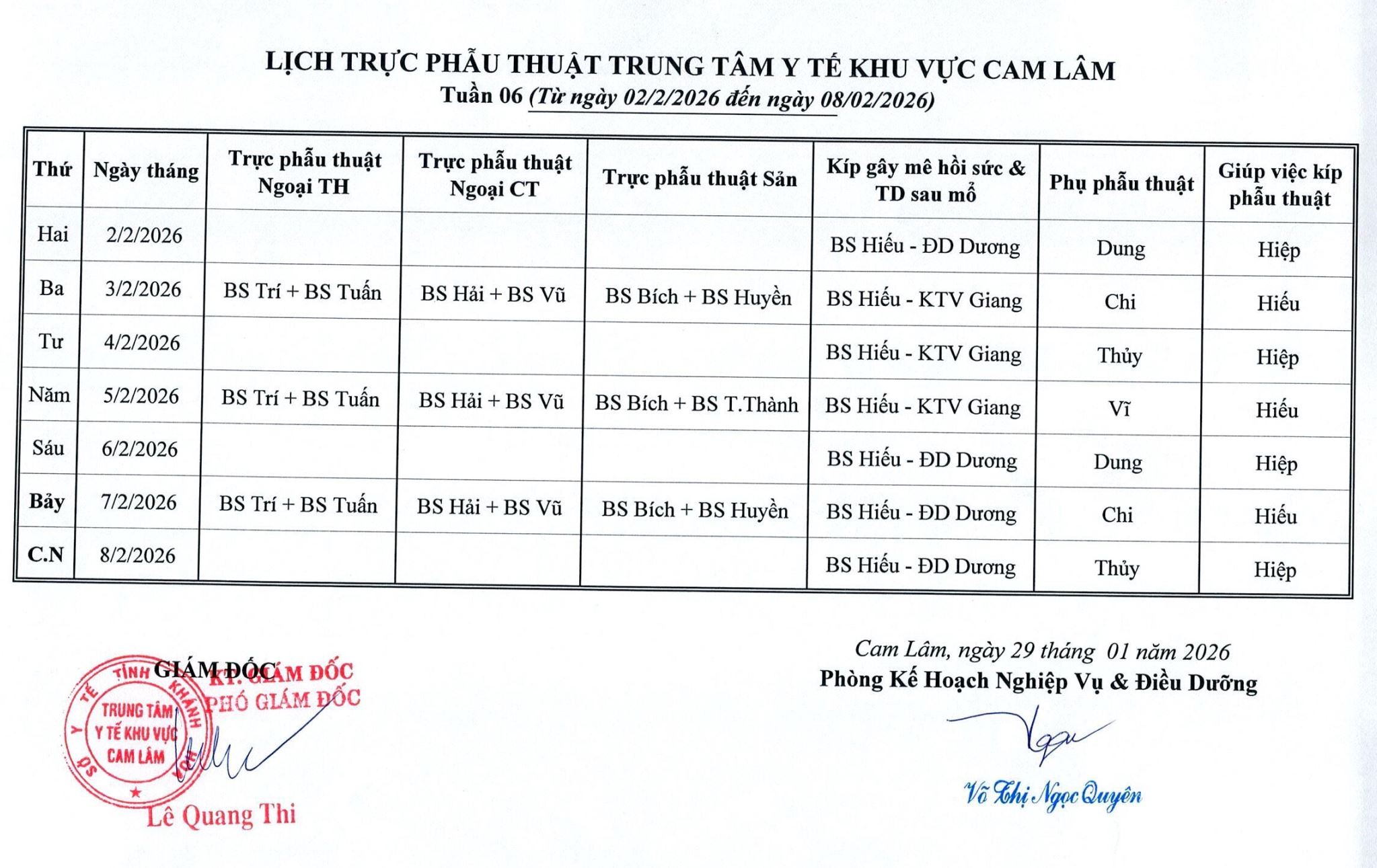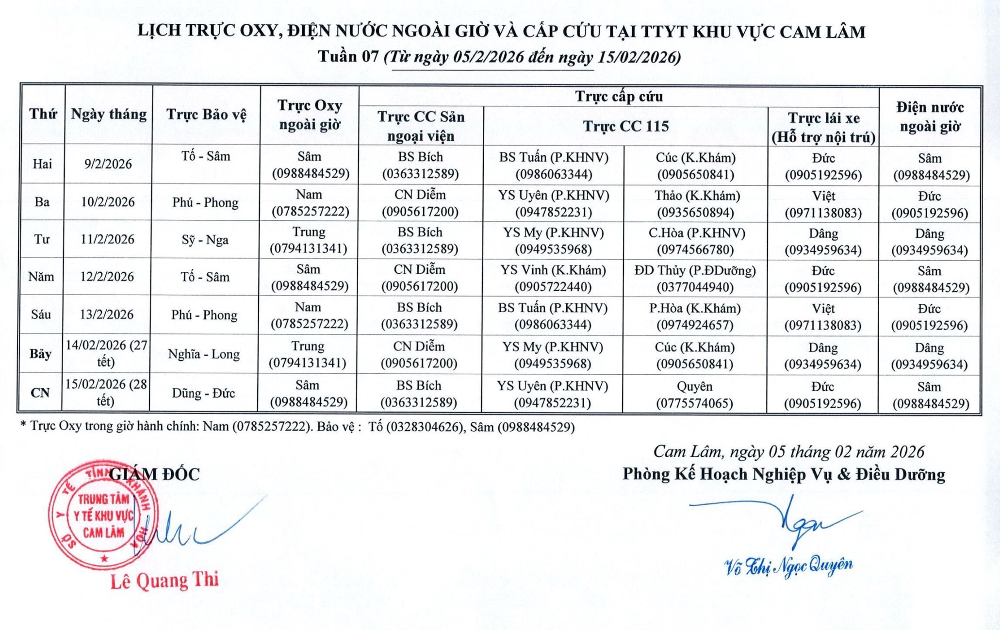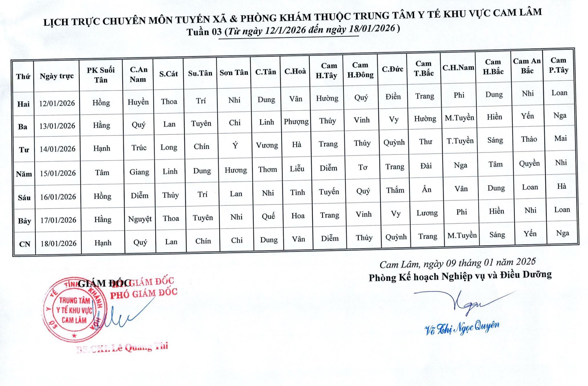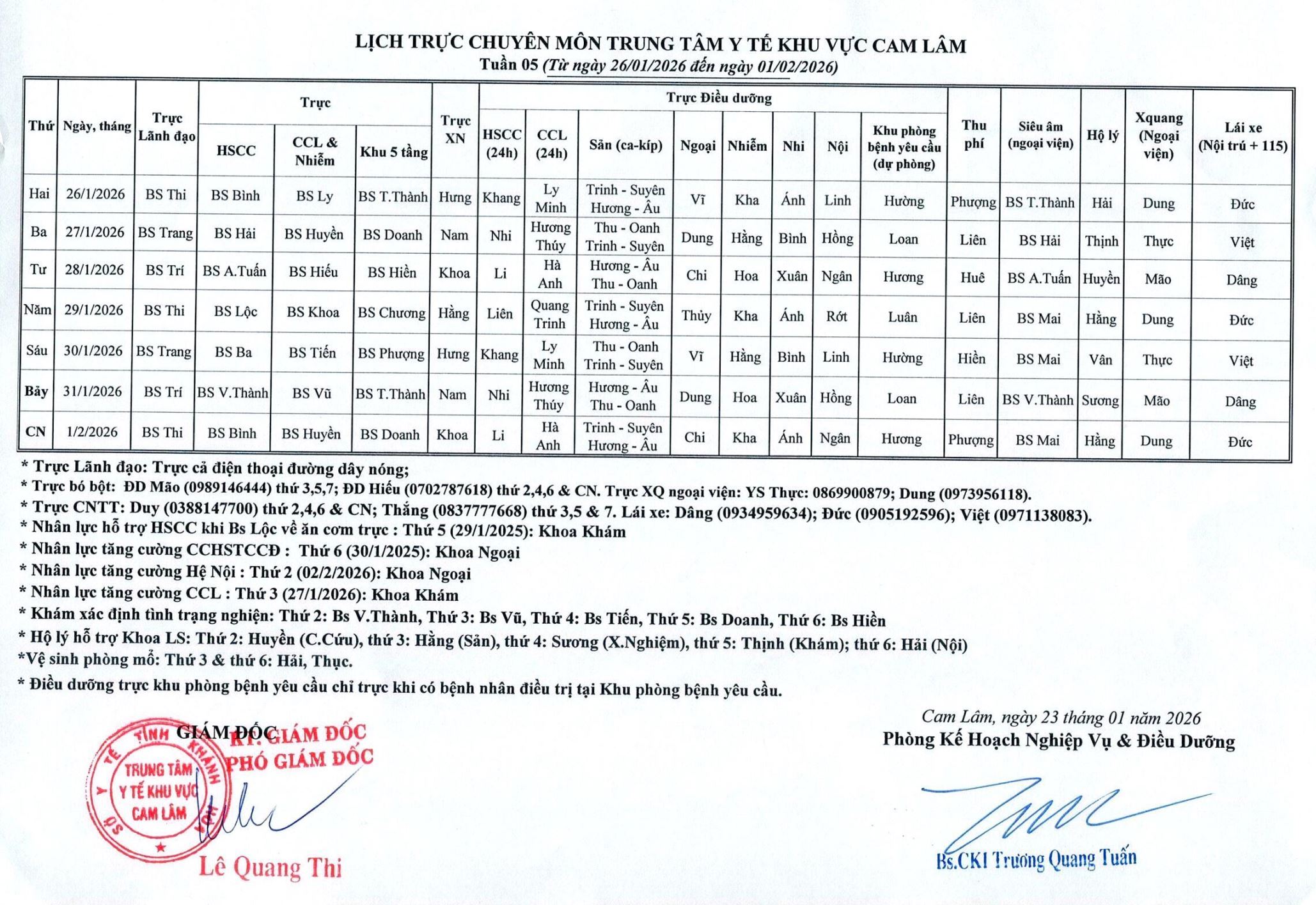 Lịch trực BV dã chiến (TTYT Cam Lâm, Đồng Cau)& LT chuyên môn tuần 35