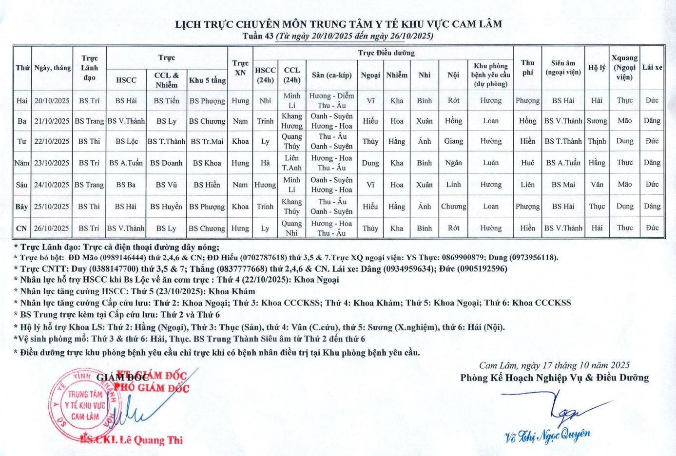 Lịch trực chuyên môn Tuần 43/2025.