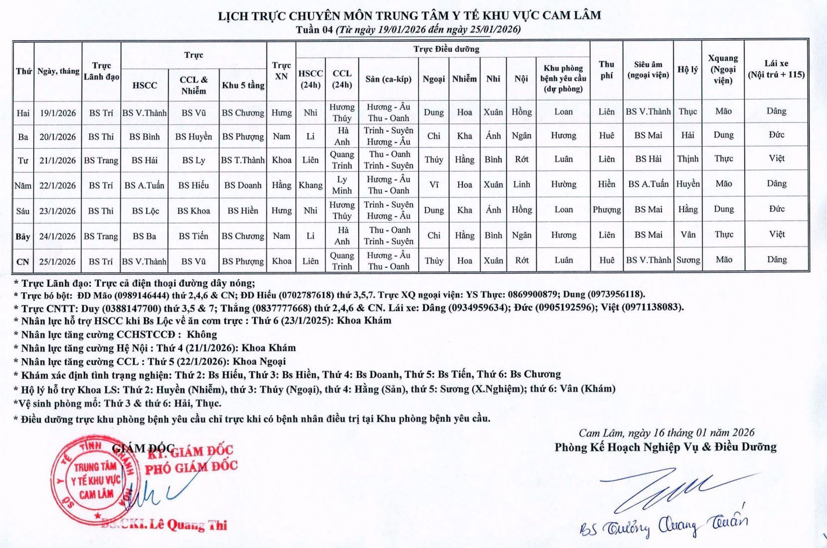 Lịch trực chuyên môn Tuần 4/2026.