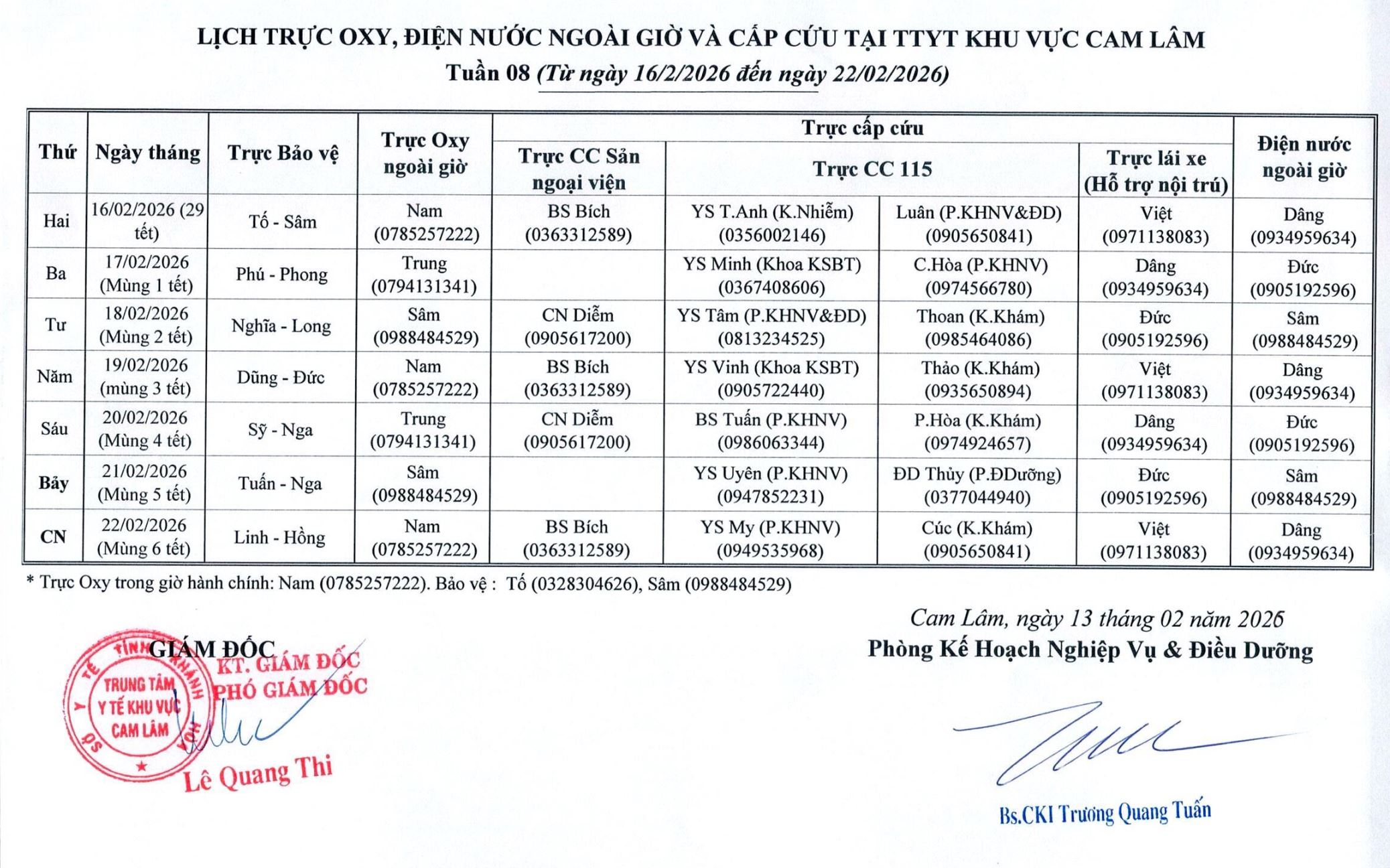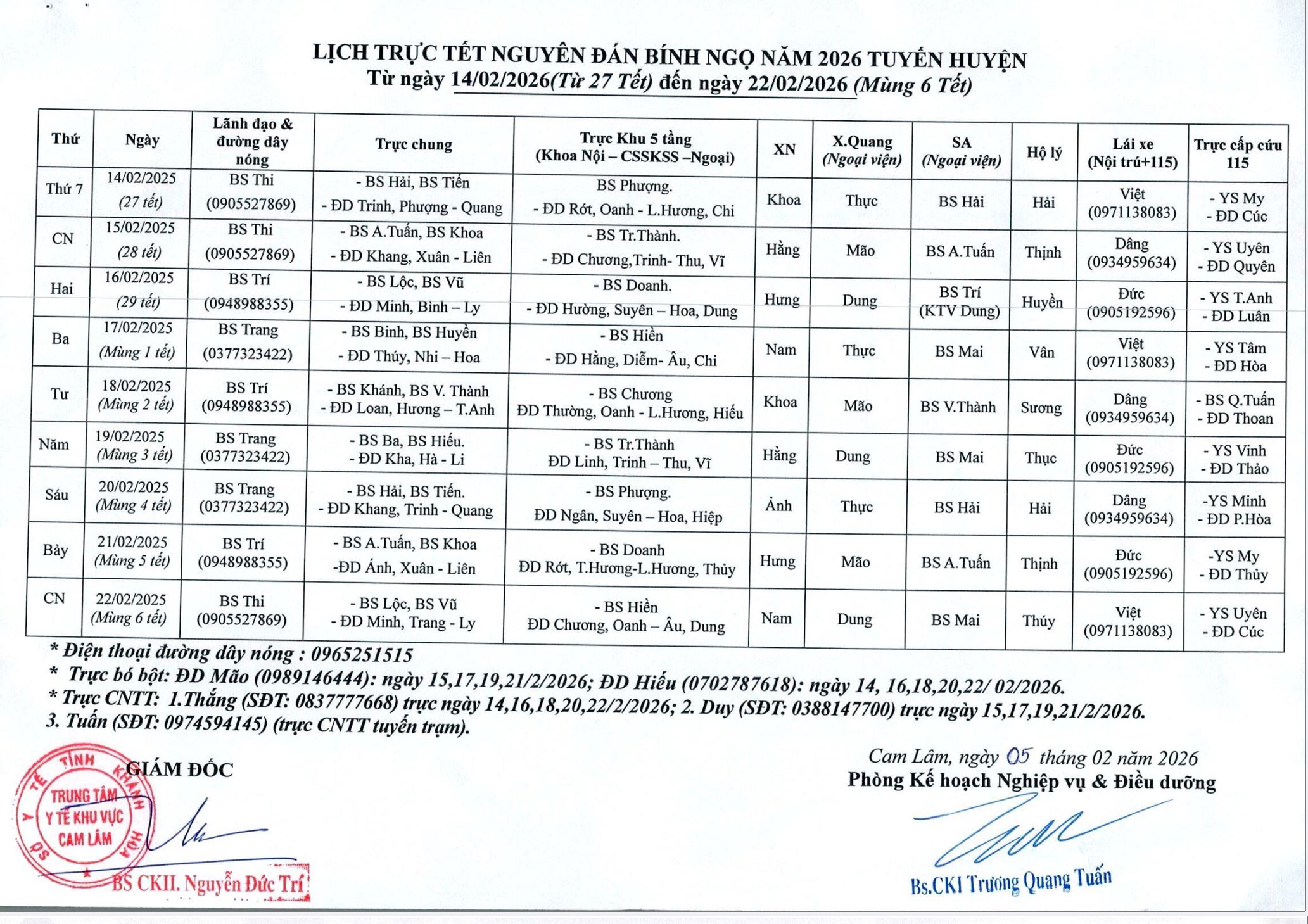 Lịch trực TẾT NGUYÊN ĐÁN 2026.