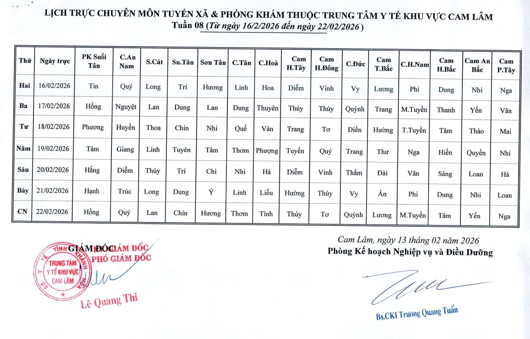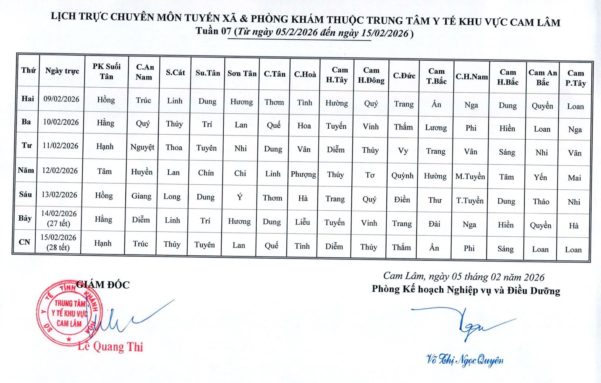 Lịch trực BV dã chiến đợt 2 (TTYT Cam Lâm, Đồng Cau)& LT chuyên môn tuần 32