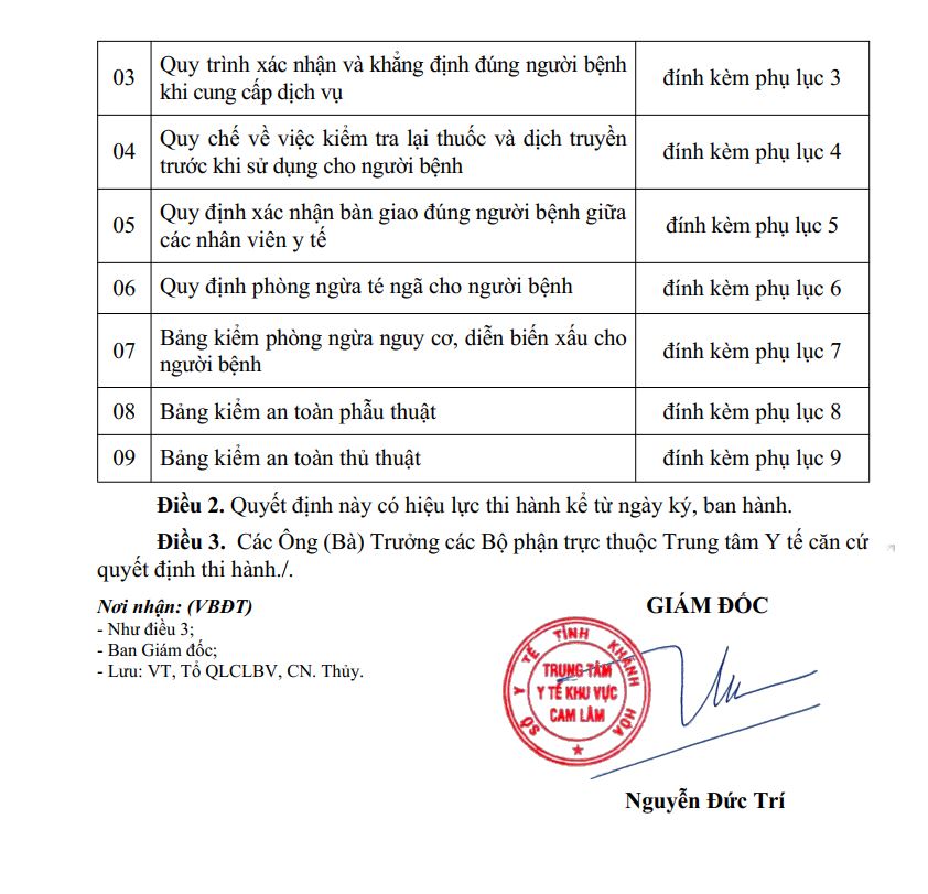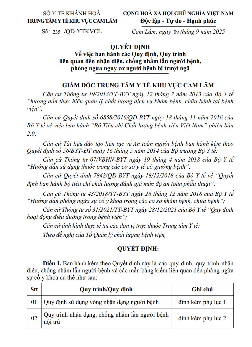QUYẾT ĐỊNH Về việc ban hành các Quy định, Quy trình liên quan đến nhận diện, chống nhầm lẫn người bệnh, phòng ngừa nguy cơ người bệnh bị trượt ngã