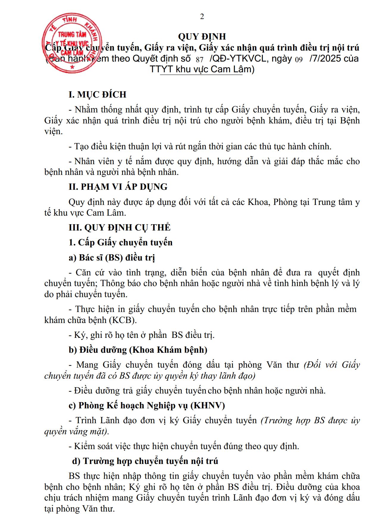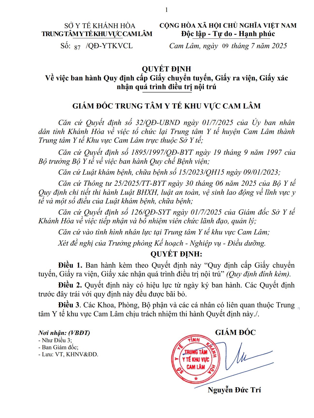 QUYẾT ĐỊNH Về việc ban hành Quy định cấp Giấy chuyển tuyến, Giấy ra viện, Giấy xác nhận quá trình điều trị nội trú 09/07/2025 0 14 FacebookTwitterPinterestWhatsApp QUYẾT ĐỊNH Về việc ban hành Quy định cấp Giấy chuyển tuyến, Giấy ra viện, Giấy xác nhận quá trình điều trị nội trú
