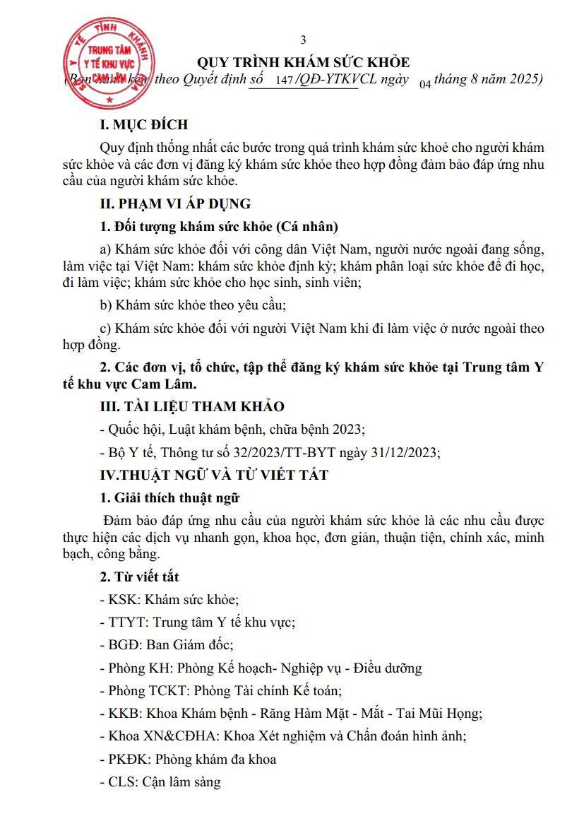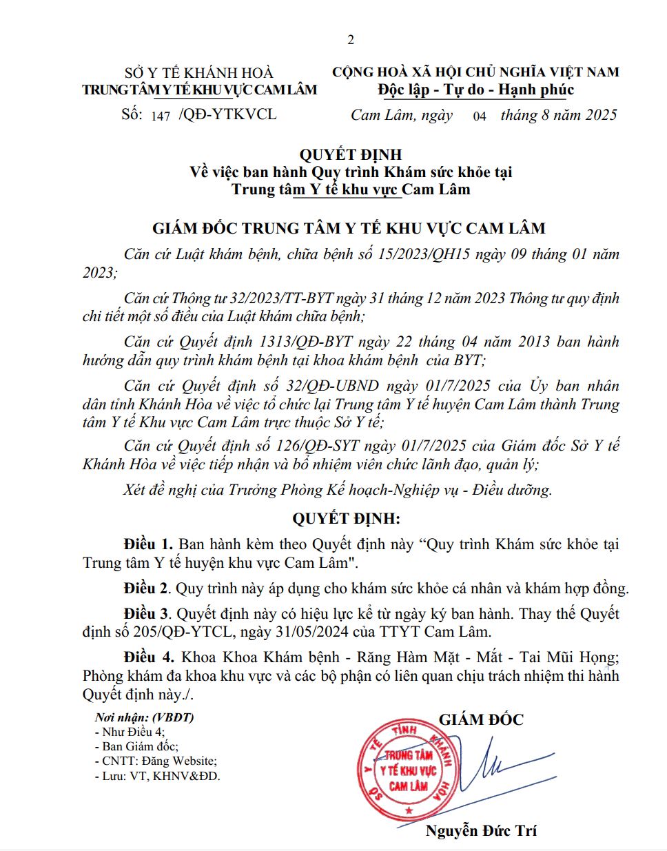 QUYẾT ĐỊNH Về việc ban hành Quy trình Khám sức khỏe tại Trung tâm Y tế khu vực Cam Lâm 06/08/2025 0 30 FacebookTwitterPinterestWhatsApp QUYẾT ĐỊNH Về việc ban hành Quy trình Khám sức khỏe tại Trung tâm Y tế khu vực Cam Lâm