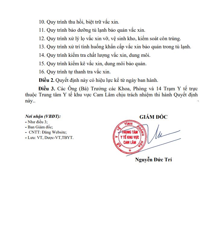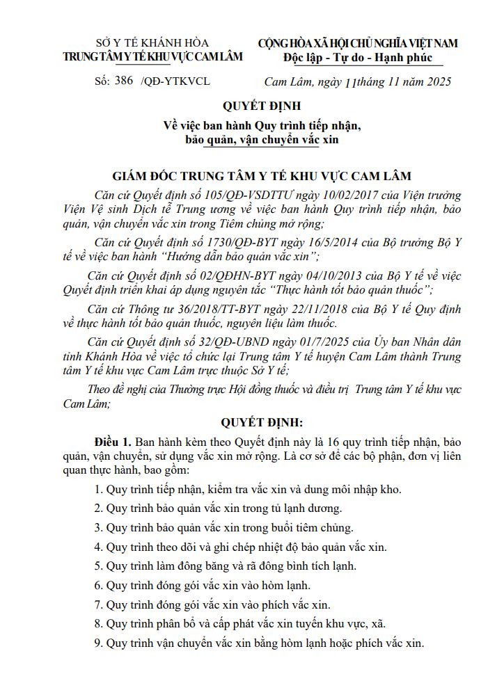 QUYẾT ĐỊNH Về việc ban hành Quy trình tiếp nhận, bảo quản, vận chuyển vắc xin 12/11/2025 0 15 FacebookTwitterPinterestWhatsApp QUYẾT ĐỊNH Về việc ban hành Quy trình tiếp nhận, bảo quản, vận chuyển vắc xin PHỤ LỤC ĐÍNH KÈM: SOP1 – QT tiếp nhận, kiểm tra vắc xin và dung môi nhập kho SOP2 – QT bảo quản vắc xin trong tủ lạnh dương SOP3 – QT bảo quản vaccin trong buổi tiêm chủng SOP4 – QT theo dõi ghi chép nhiệt độ bảo quản vắc xin- SOP5 – QT làm đông băng và rã đông bình phích SOP6 – QT đóng gói vắc xin vào hòm lạnh SOP7 – QT đóng gói vắc xin vào phích vắc xin SOP8 – QT phân bổ cấp phát vắc xin SOP9 – QT vận chuyển vắc xin bằng hòm lạnh hoặc phích vắc xin SOP10 – QT thu hồi, biệt trữ vắc xin SOP11 – QT bảo dưỡng tủ lạnh bảo quản vắc xin SOP12 – QT xử lý lọ vắc xin vỡ, VS kho, kiểm soát côn trùng SOP13 – QT xử lý tình huống khẩn cấp vắc xin bảo quản trong tủ lạnh SOP14 – QT kiểm tra chất lượng vắc xin, dung môi SOP15 – QT kiểm kê vắc xin, dung môi bảo quản SOP16 – QT Tự thanh tra vắc xin