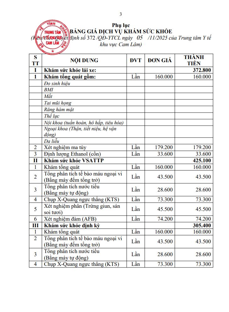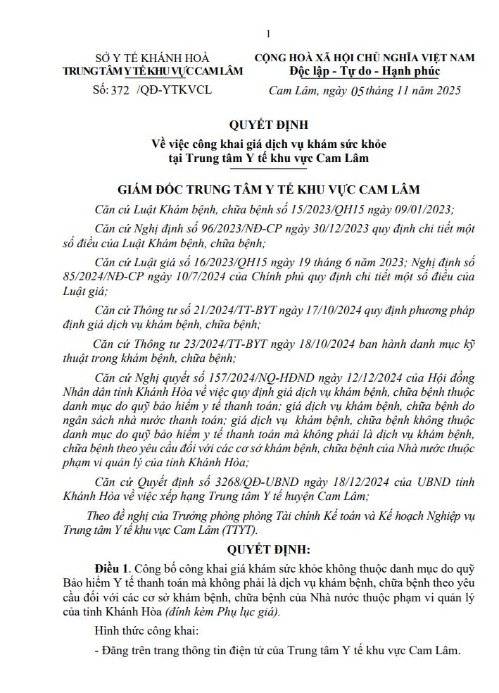 QUYẾT ĐỊNH Về việc công khai giá dịch vụ khám sức khỏe tại Trung tâm Y tế khu vực Cam Lâm 06/11/2025 0 39 FacebookTwitterPinterestWhatsApp QUYẾT ĐỊNH Về việc công khai giá dịch vụ khám sức khỏe tại Trung tâm Y tế khu vực Cam Lâm