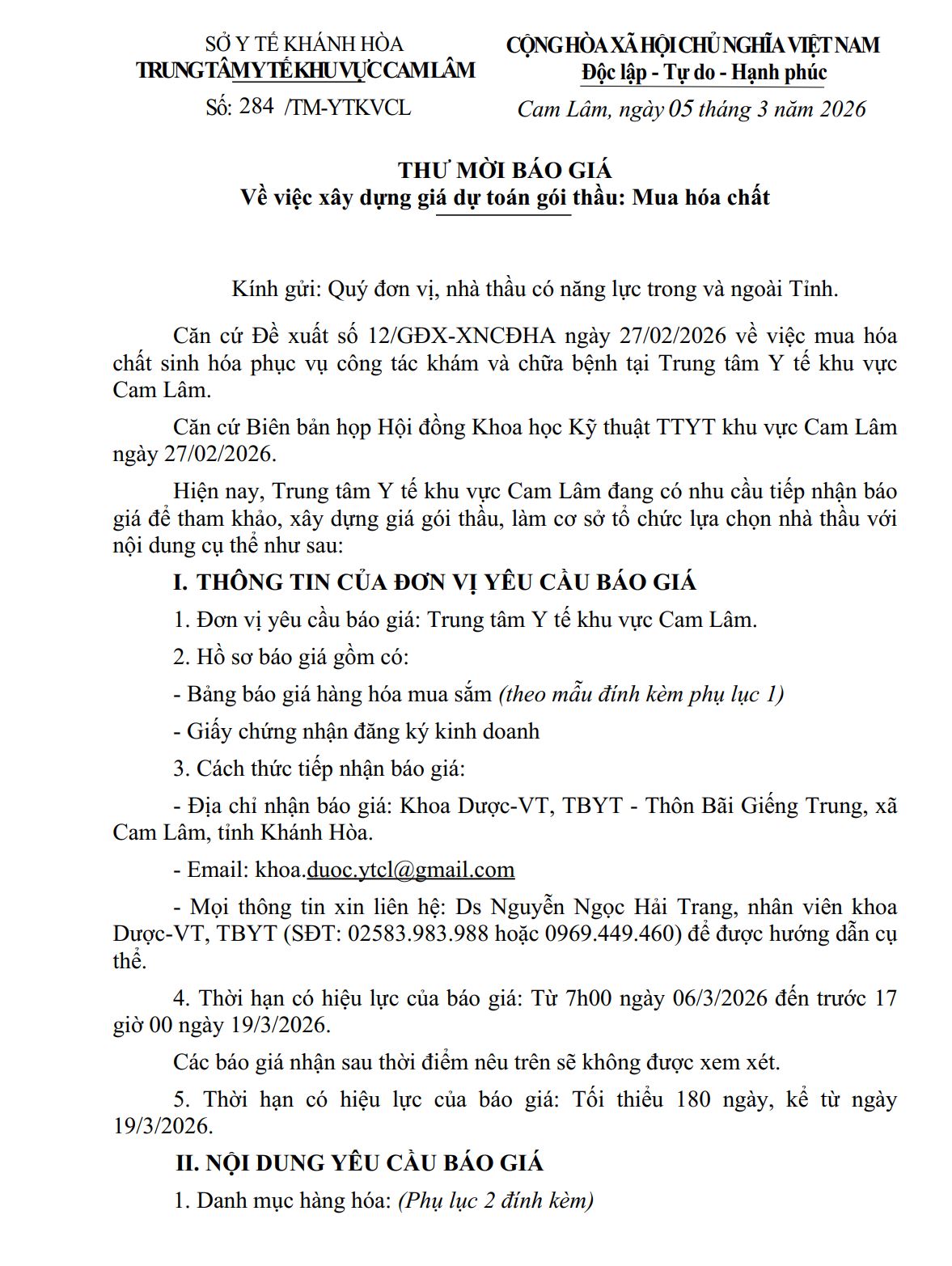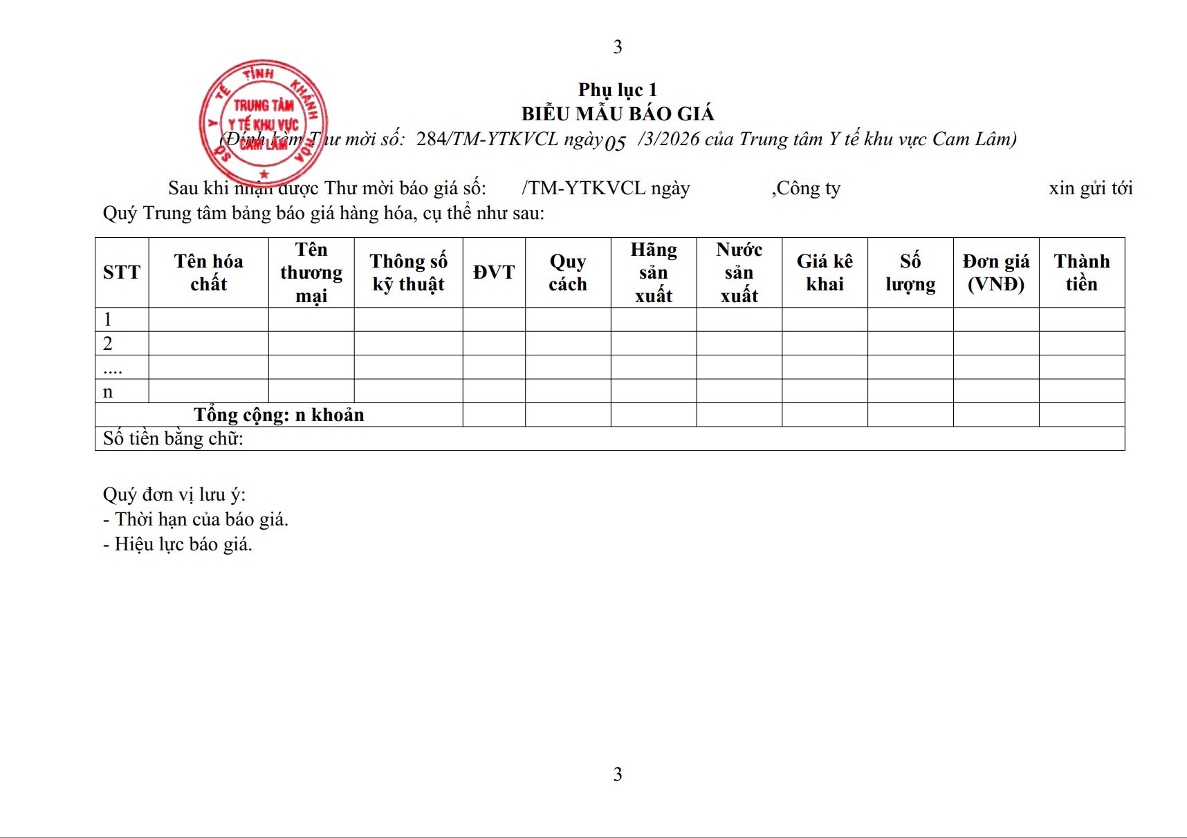 THƯ MỜI BÁO GIÁ Về việc xây dựng giá dự toán gói thầu: Mua hóa chất 06/03/2026 0 4 FacebookTwitterPinterestWhatsApp THƯ MỜI BÁO GIÁ Về việc xây dựng giá dự toán gói thầu: Mua hóa chất