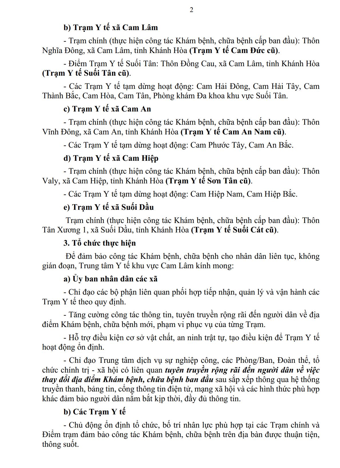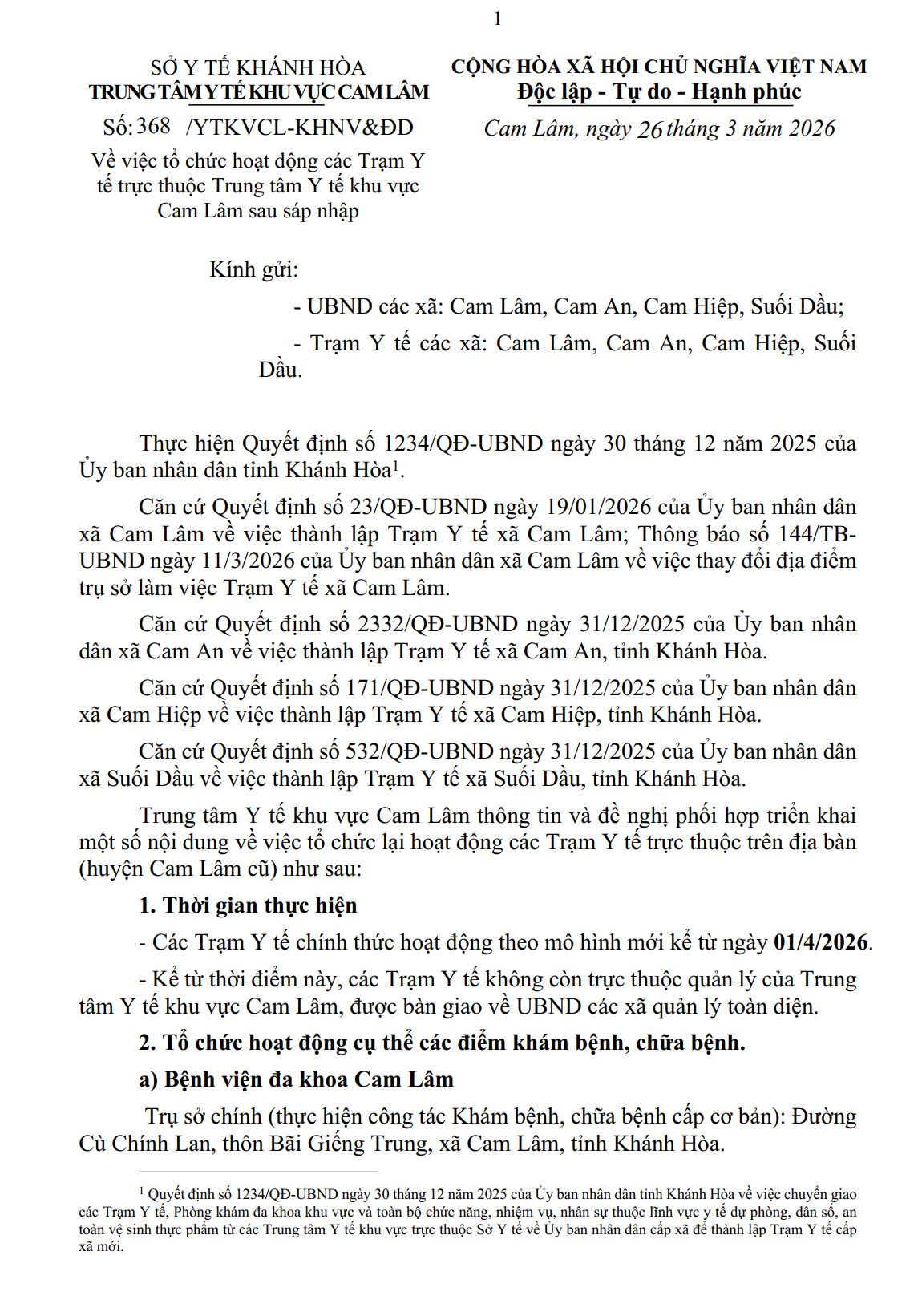 Về việc tổ chức hoạt động các Trạm Y tế trực thuộc Trung tâm Y tế khu vực Cam Lâm sau sáp nhập 26/03/2026 0 164 FacebookTwitterPinterestWhatsApp Về việc tổ chức hoạt động các Trạm Y tế trực thuộc Trung tâm Y tế khu vực Cam Lâm sau sáp nhập